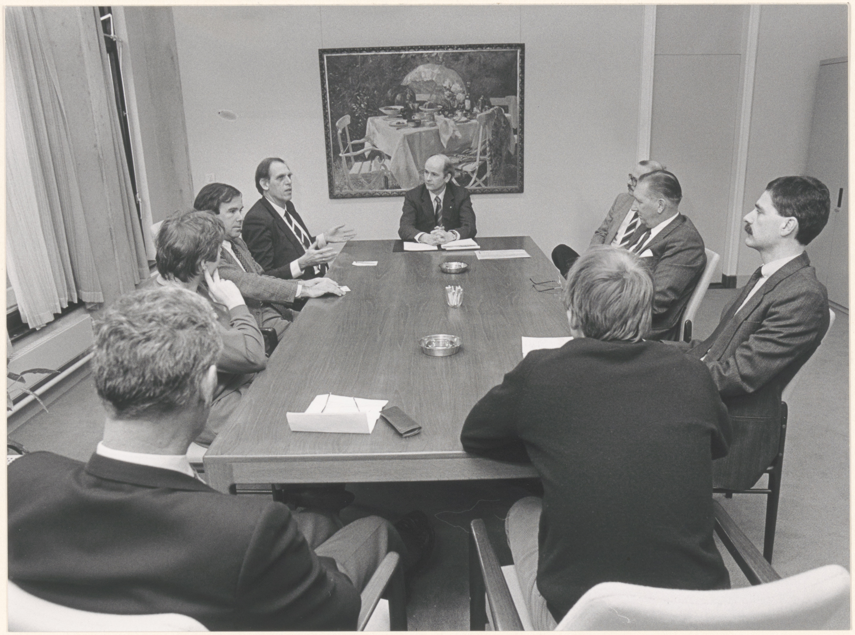 - Oriëntatiebezoek van de 2e-kamerleden voor de VVD drs. Frans W. Weisglas en H.F. Dijkstal aan de arrondissementsrechtbank te Dordrecht aan het Steegoversloot. Achter de tafel mr. Geertsema, rechter; rechts wethouder Maas; ook aanwezig de heren Schaap pr-man VVD Dordt en fractievoorzitter VVD Dordt Brandts; thema: alternatieve straffen en automatisering.