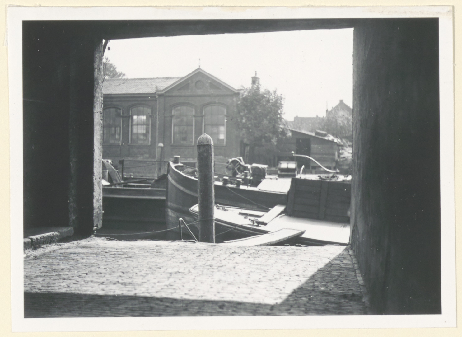 - Een gedeelte van het schoolgebouw aan de noordzijde van de Hellingen op de hoek van de Spuiweg, gezien over de Spuihaven vanuit de Botgenspoort aan de Boogjes.