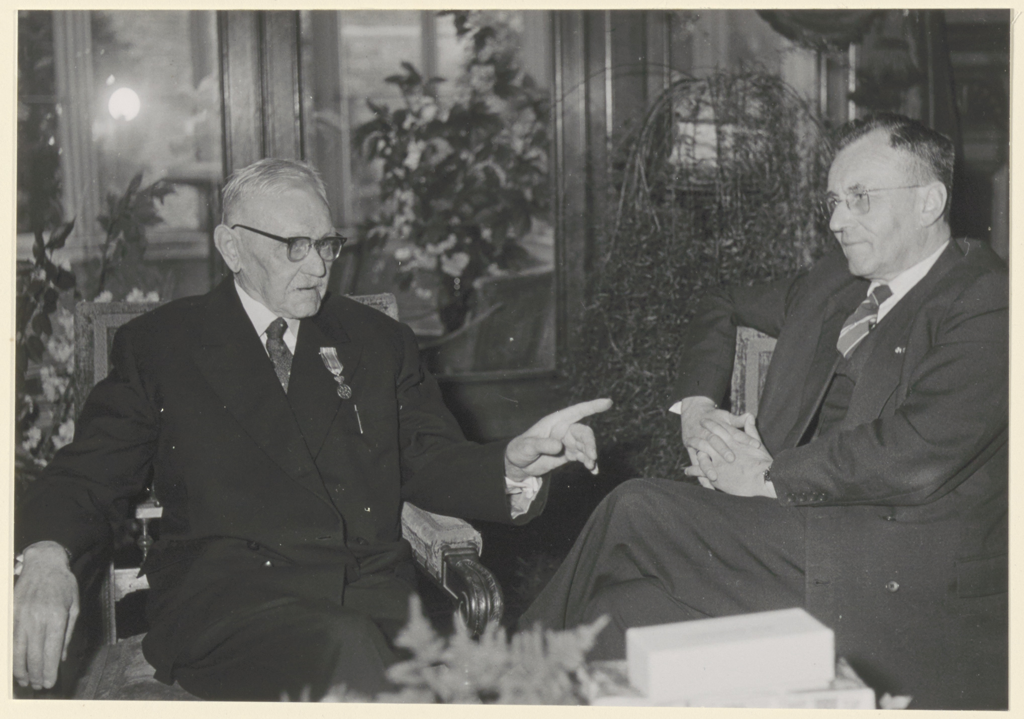 - Uitreiking van een koninklijke onderscheiding door burgemeester Van der Dussen aan Adr. Robbemond, tot 1 maart 1961 suppoost in het Museum Mr. Simon van Gijn aan de Nieuwe Haven.