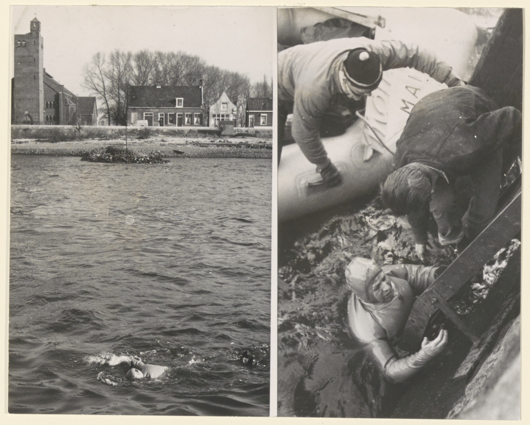 Links de Franse zwemmer Le Lourmais op zijn zwemtocht Schaffhausen - Rotterdam in de Merwede bij de Nederlands Hervormde Kerk aan de Kerkbuurt in Papendrecht. Rechts zijn aankomst in Dordrecht.