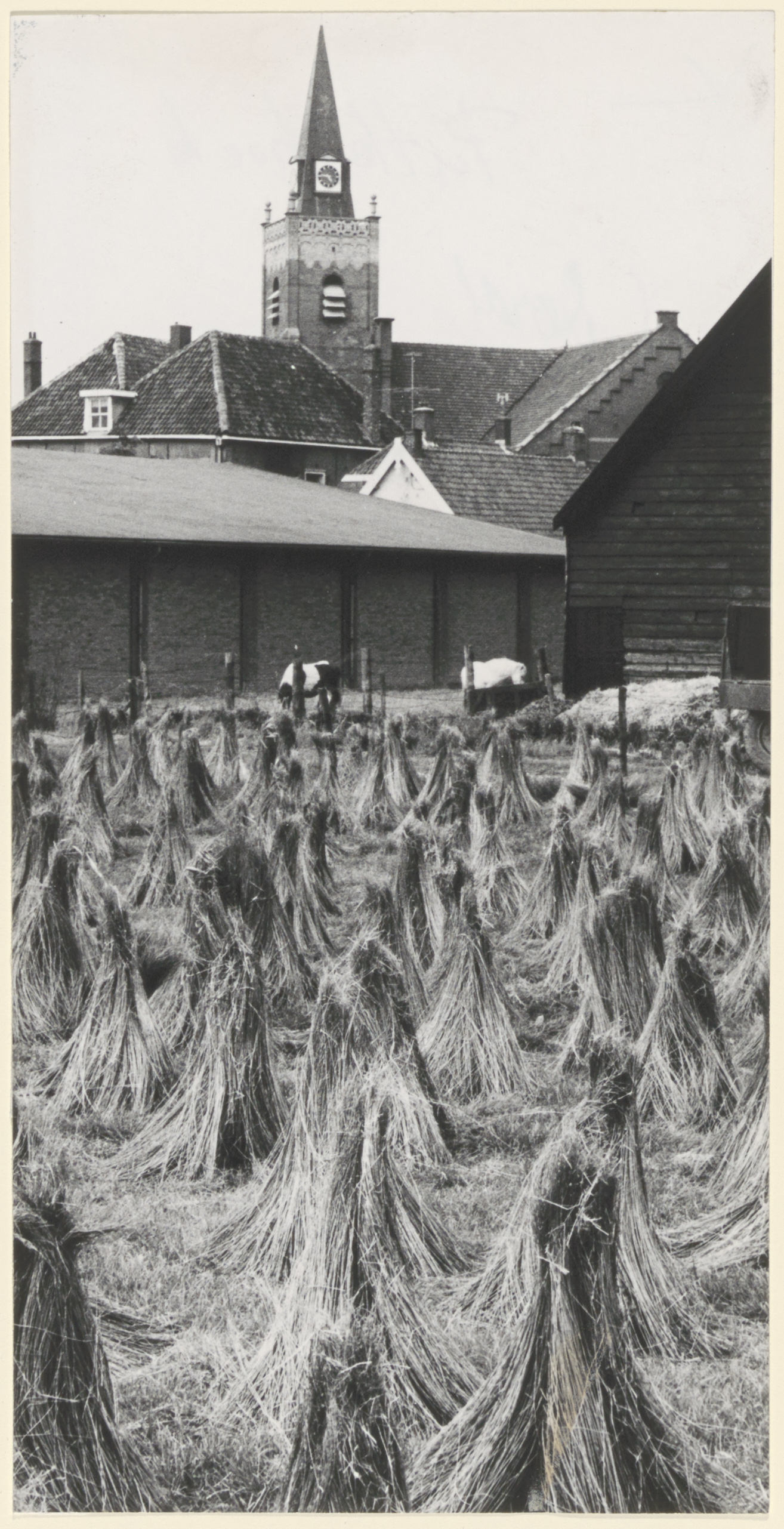 De Nederlands Hervormde Kerk over een veld met juist geoogst vlas in het vlasdorp …