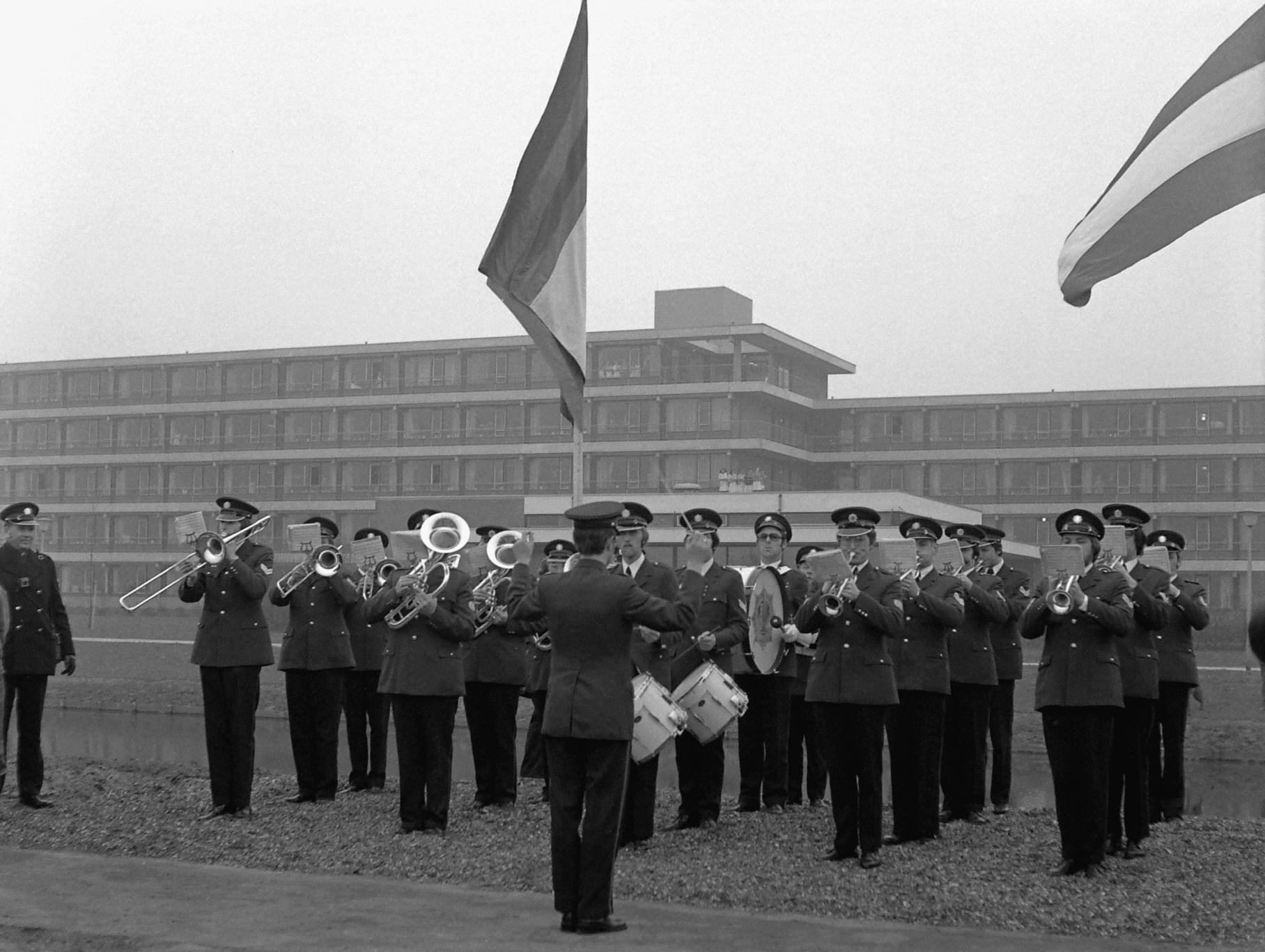 Politiekapel op de boomplantdag in park Dubbelmonde bij het bejaardentehuis Dubbelmonde
