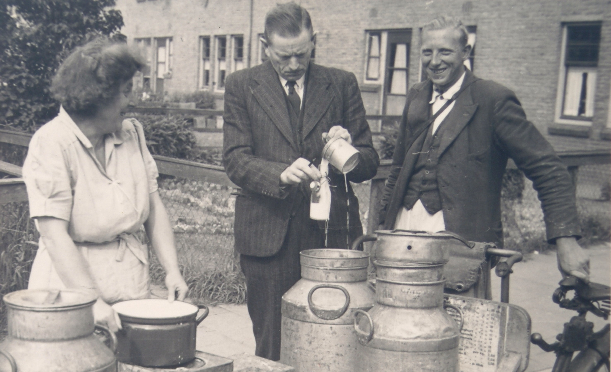 - Keurmeester N. Pols van de Keuringsdienst van Waren neemt een monster melk bij een melkboer