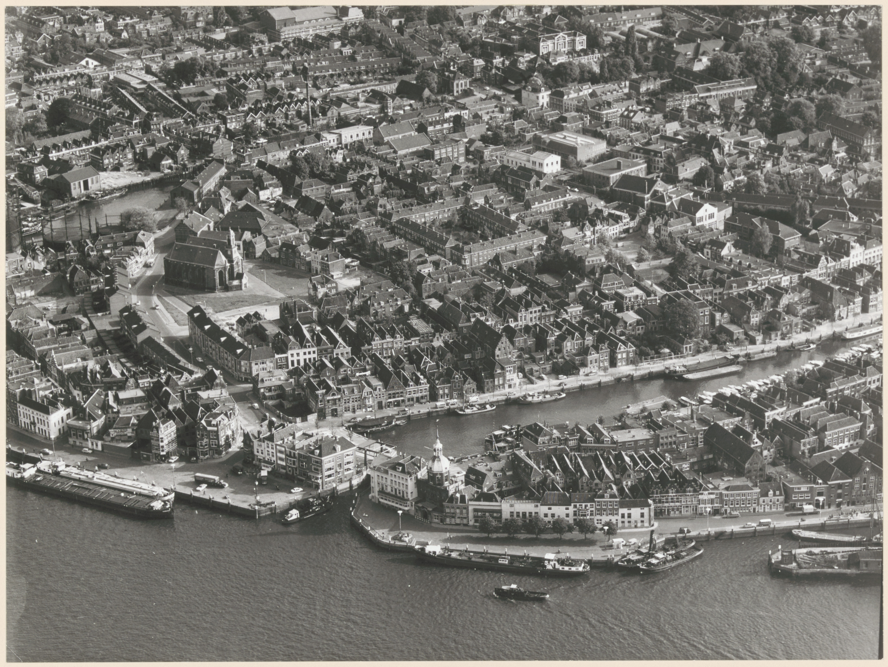 Luchtfoto van het gebied vanaf het Groothoofd naar het zuiden. Vooraan v.l.n.r. de Merwekade, het Bolwerk, het Groothoofd en de Kuipershavn. Groothoofdspoort, In het midden links, de Nieuwkerk.