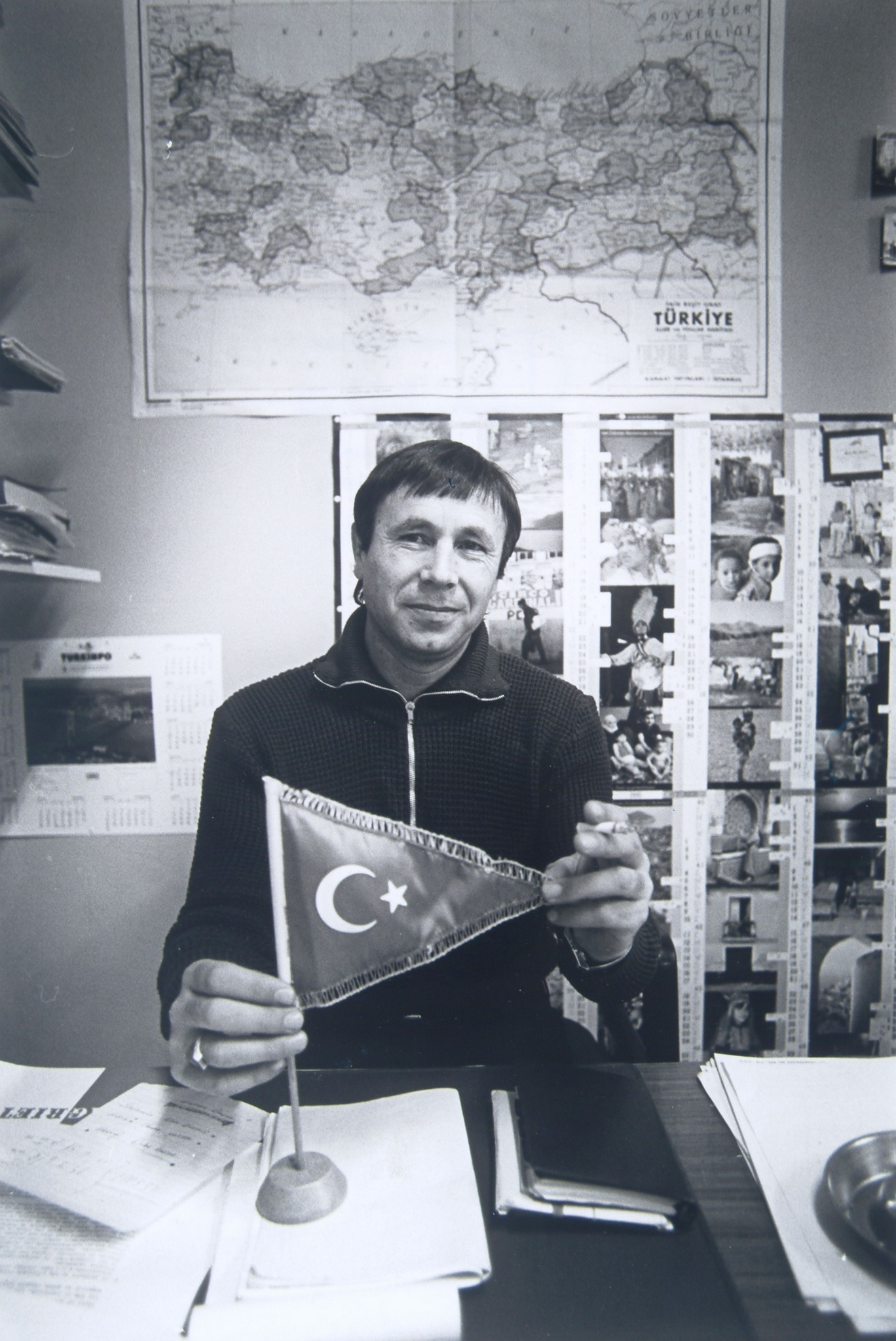 - Portret van Sabri Bahçe, gemeenteraadslid PvdA te Dordrecht, met Turks vaandel