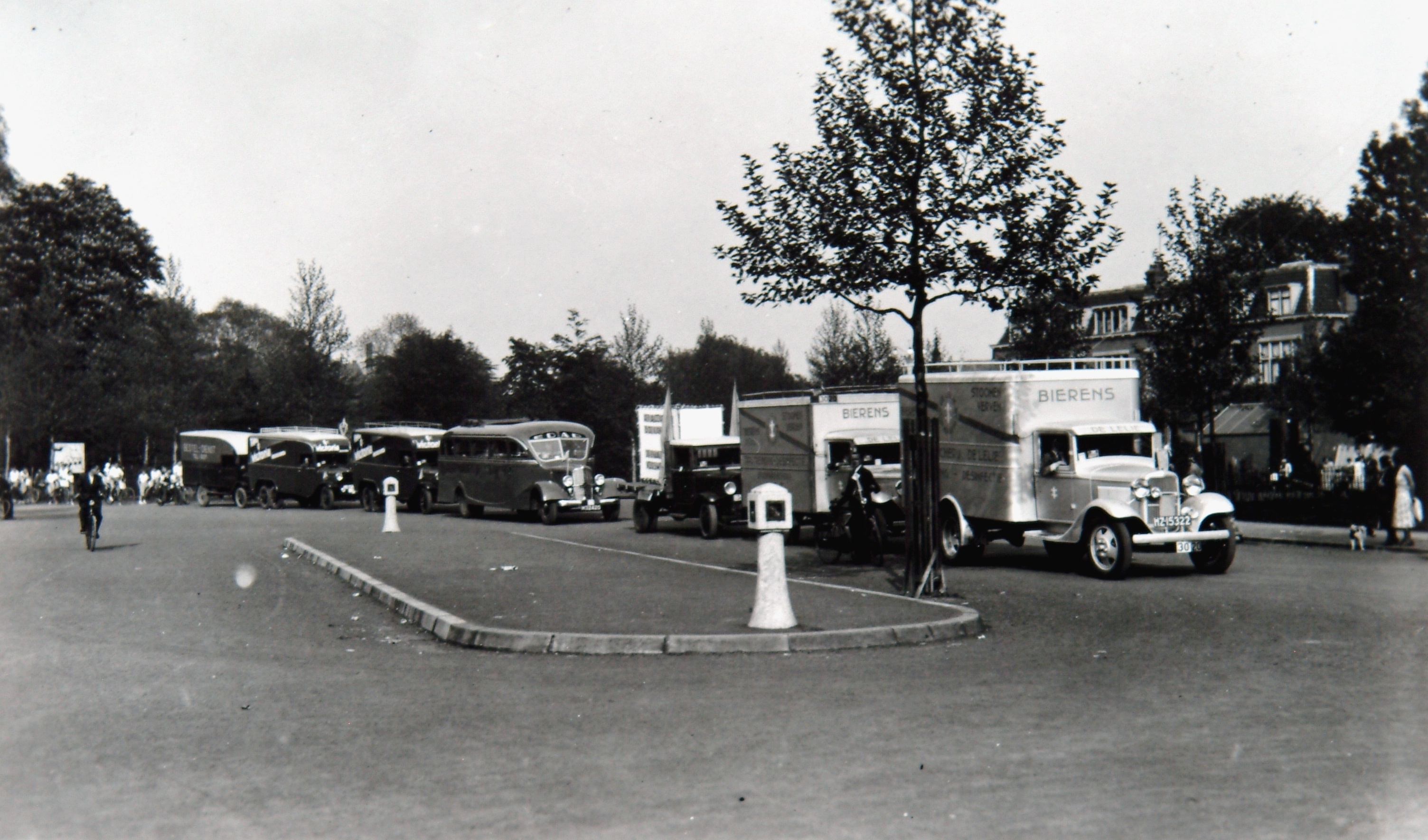 Blik vanuit het Oranjepark in de richting Vrieseweg. Vrachtauto's van wasserij/stomerij Bierens, een bus van E.D.A.D. vrachtauto's van Victoria biscuit- en chocoladefabriek en een vrachtauto van een besteldienst zijn vertegenwoordigers van het bedrijfsleven bij de opening van de Blauwe Week (geheelonthouding).