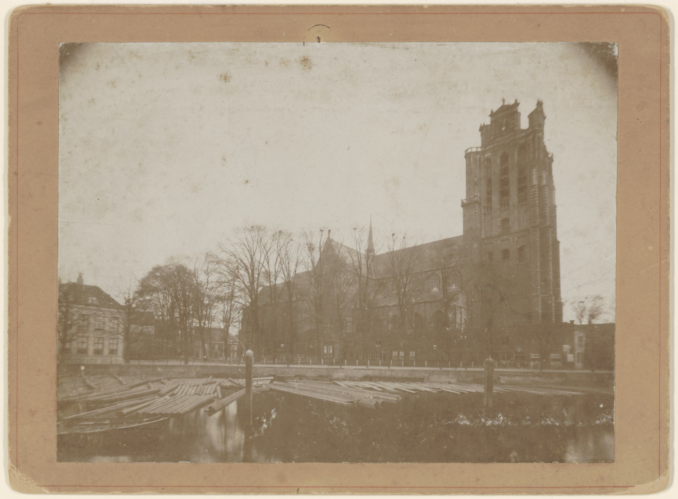 - Het Maartensgat met houtvlotten, gezien in de richting van de Grote Kerk. Op achterzijde: 'Áandenken aan de Kampong te Dordrecht de Missiyit (Missiejit) Daniël van der Sande Amateur-fotograaf'; de foto is afkomstig van de arts H.J. de Graaf; Van der Sande, importeur van rijwielen, later makelaar, woonde rond 1900 aan het Maartensgat.