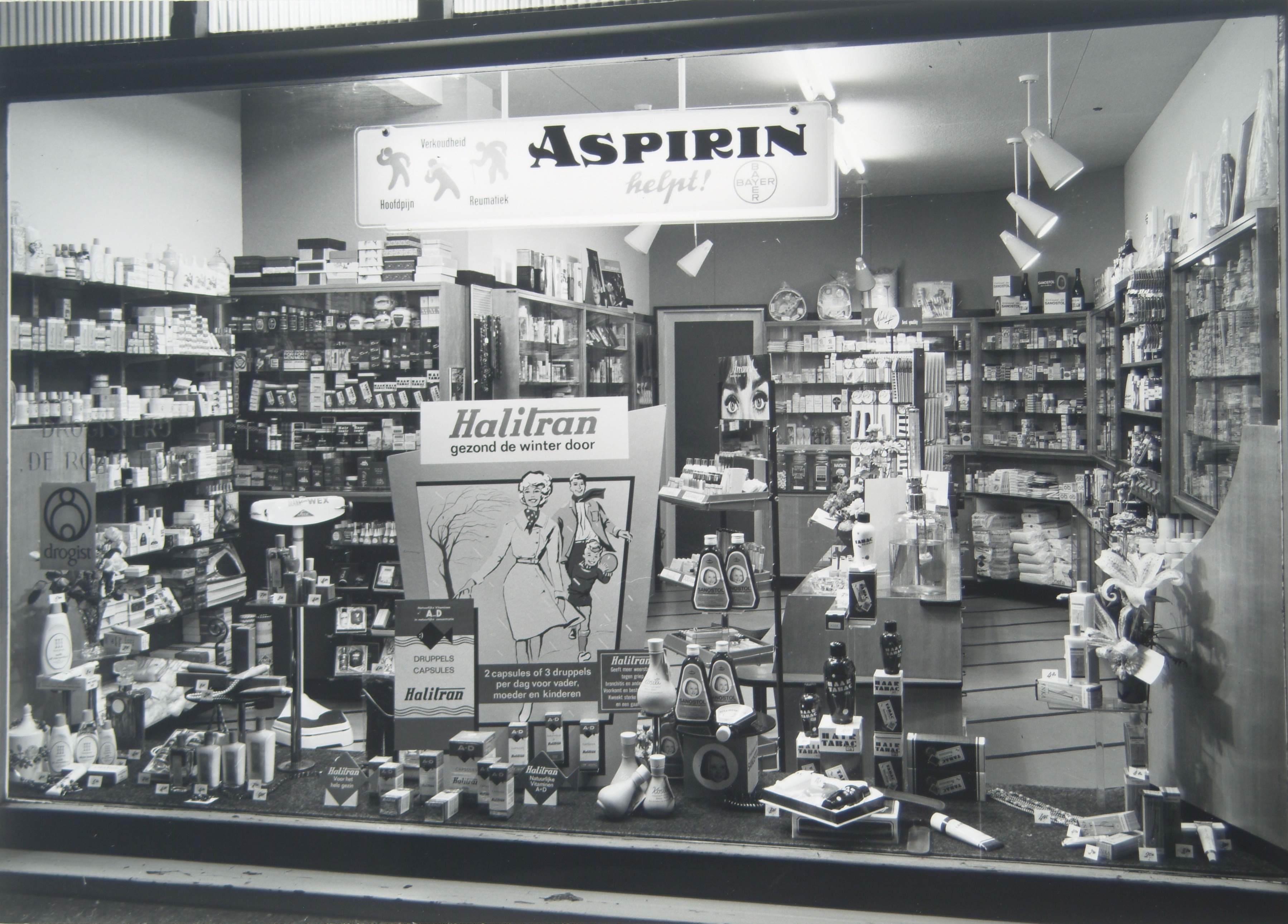 Etalage van drogisterij de Rozijnkorf aan de Voorstraat