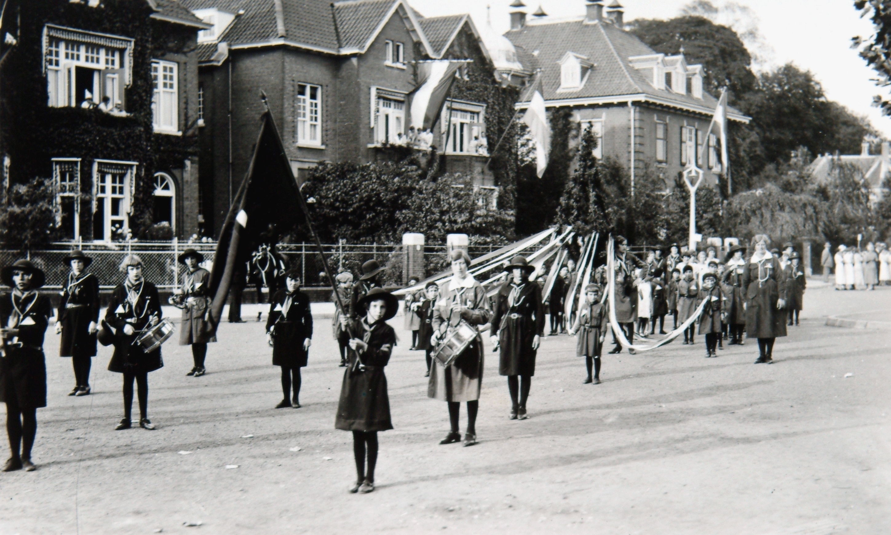 Een groep welpen en scouts in het Oranjepark dragen een meiboom mee in de optocht.