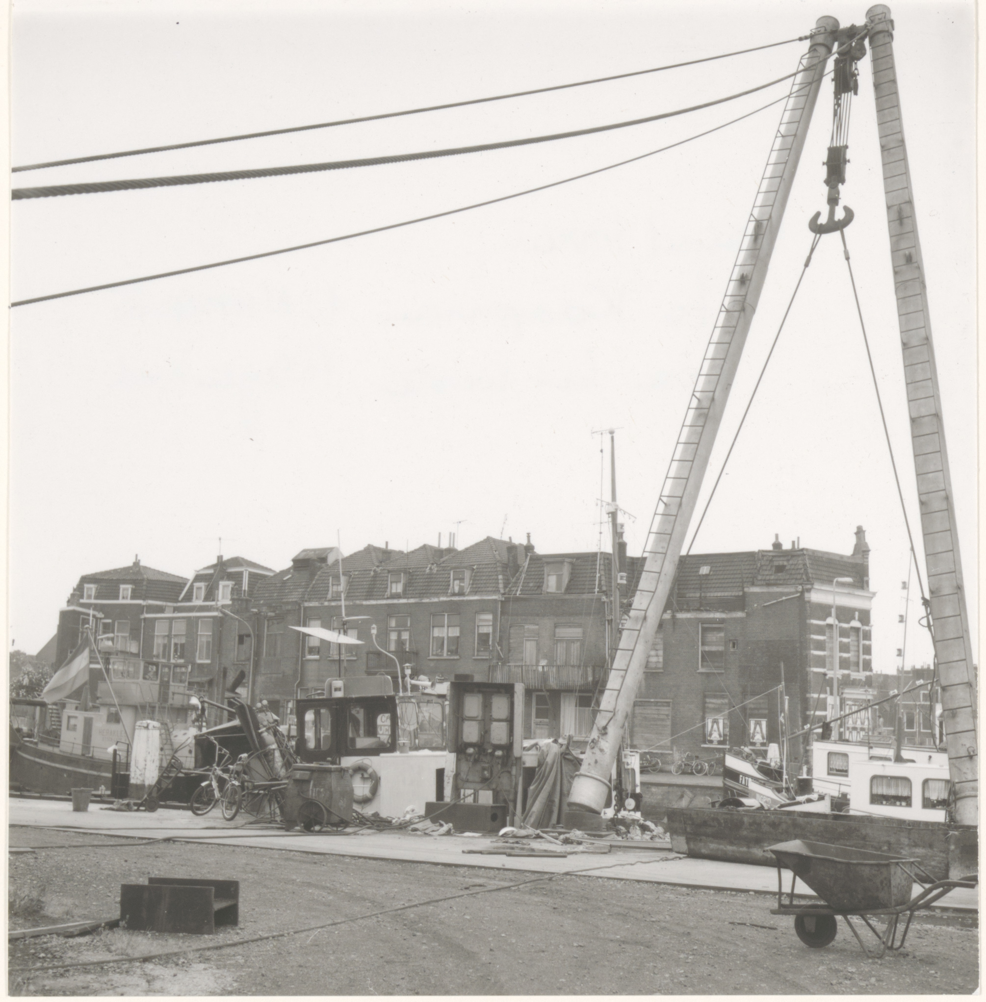 - Gezicht vanaf de scheepswerf Koopman over de Riedijkshaven op de achterzijde van huizen aan de oostzijde van de Bleijenhoek; op de voorgrond een kraan en een kruiwagen.