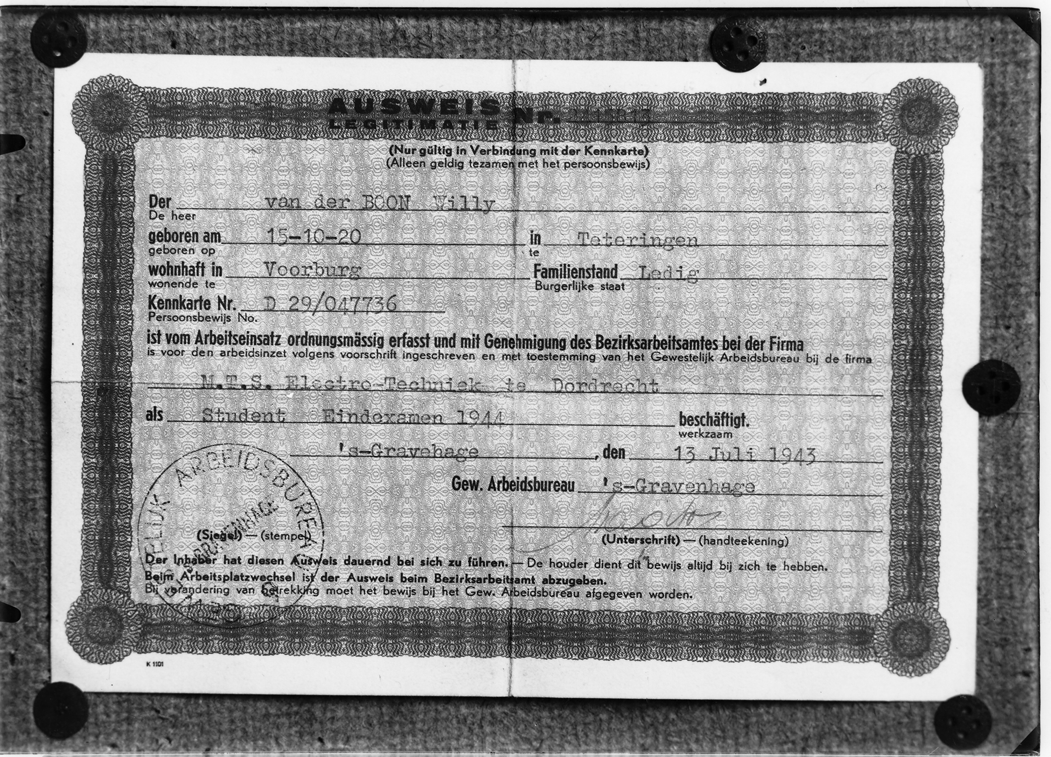 - Ausweis van Willy van der Boon, student MTS Dordrecht, uitgegegeven door het arb. bureau 1943