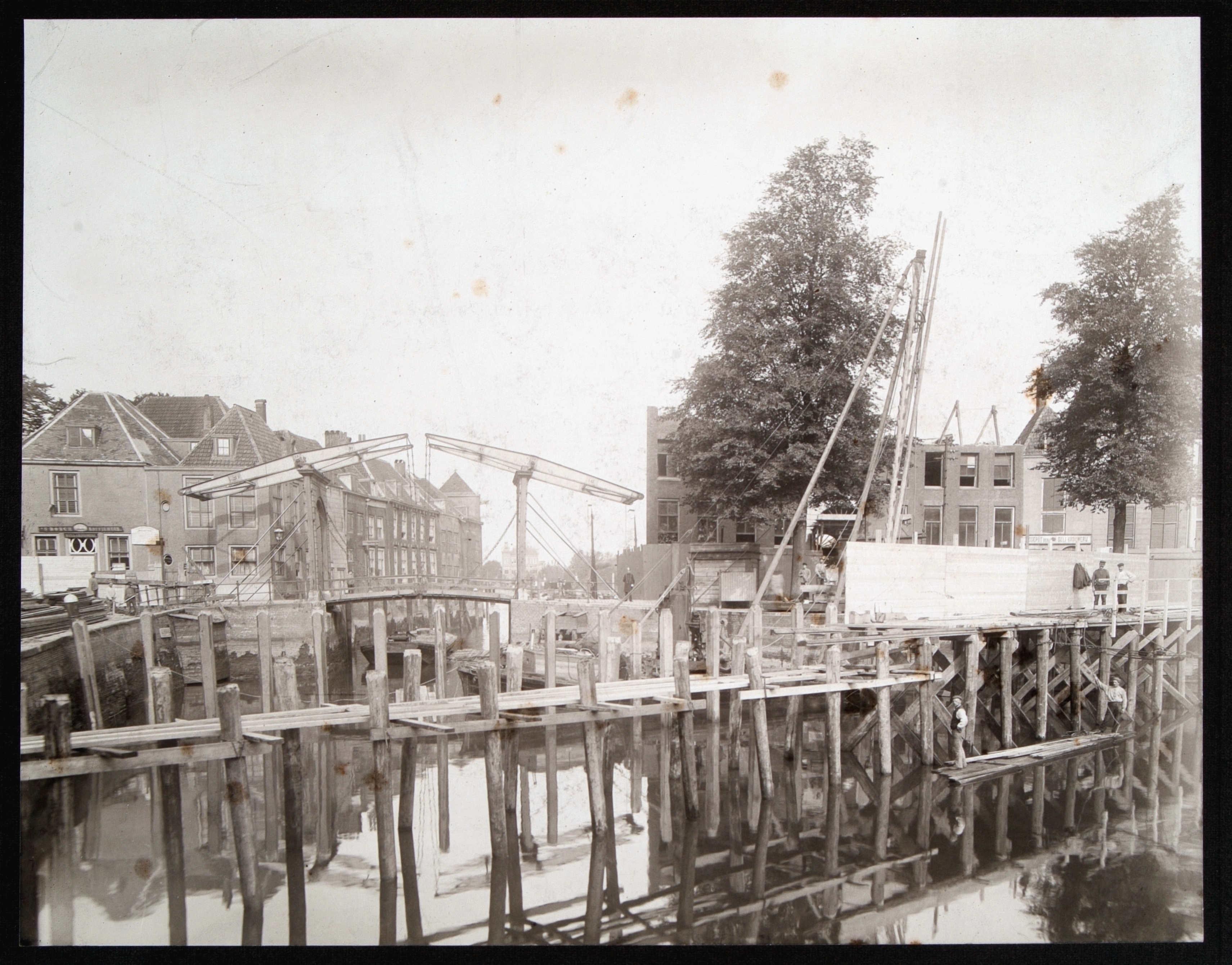 Engelenburgerbrug over de Nieuwe Haven en sloop van de Blauwpoort. Links de Korte …