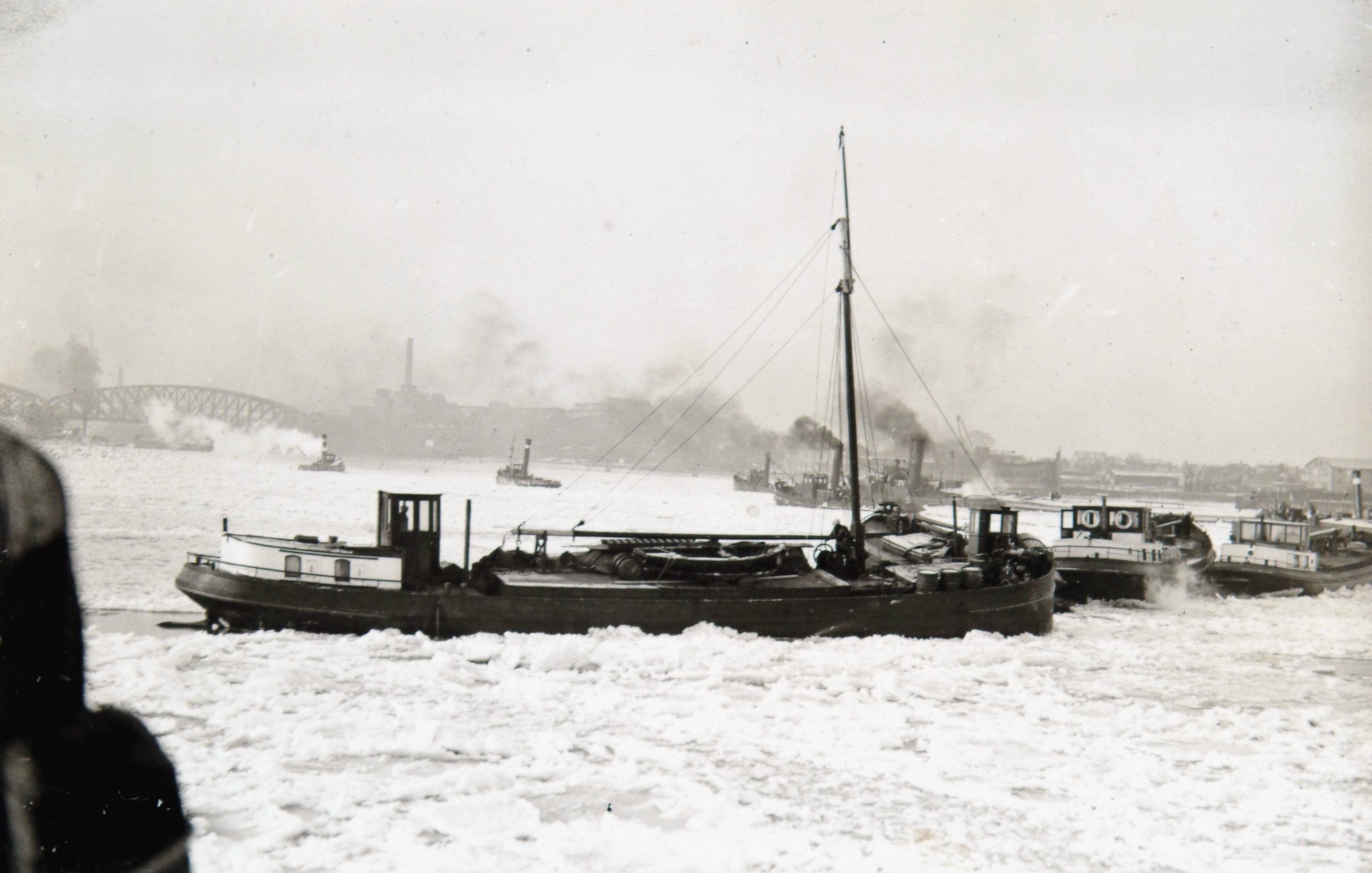 Vrachtschepen voorafgegaan door ijsbrekers op de Oude Maas. Op de achtergrond de spoorbrug naar Zwijndrecht.