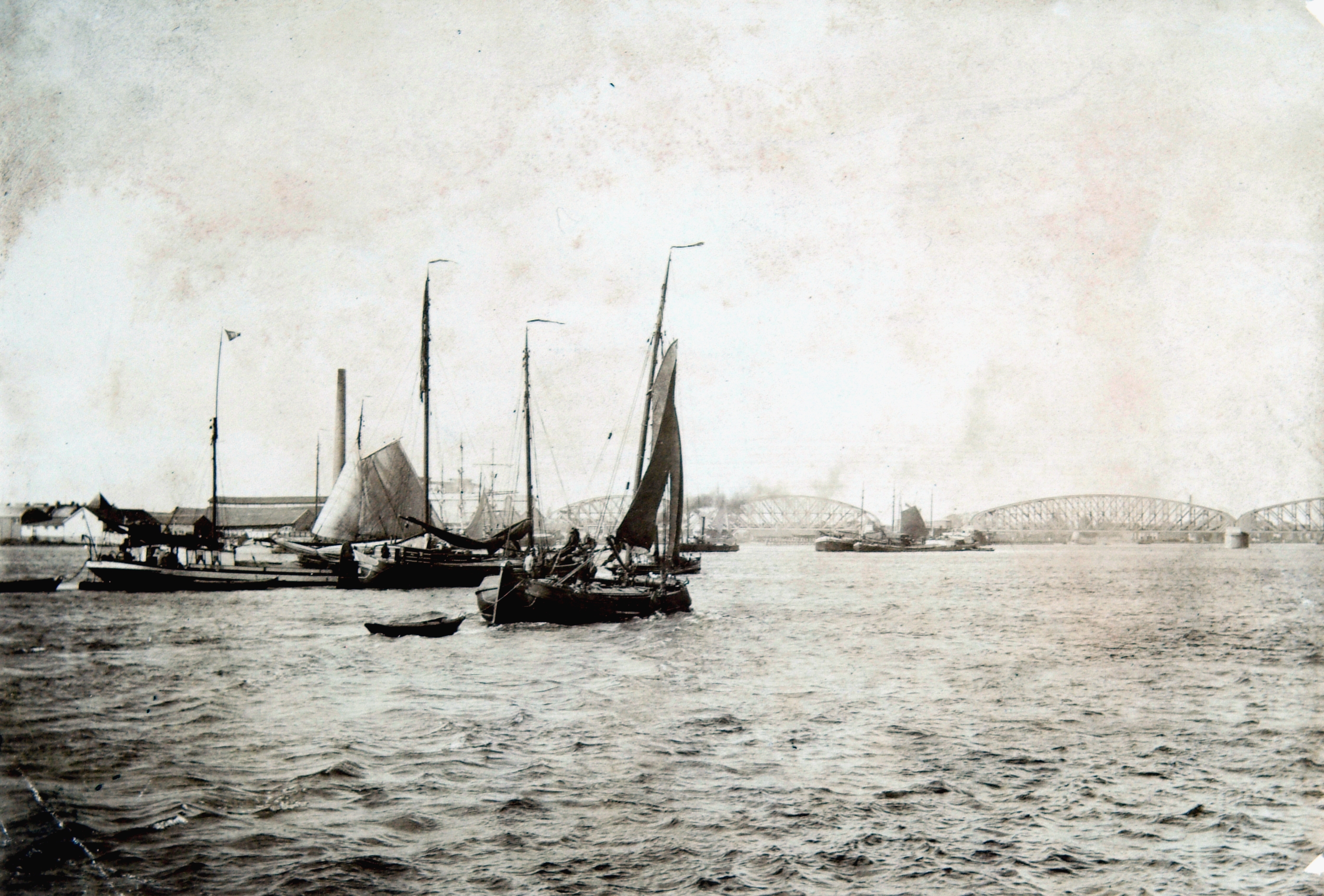 - Zeilvrachtschepen op de Oude Maas, gezien vanuit de Dordtsche Kil in de richting van de spoorbrug naar Zwijndrecht.