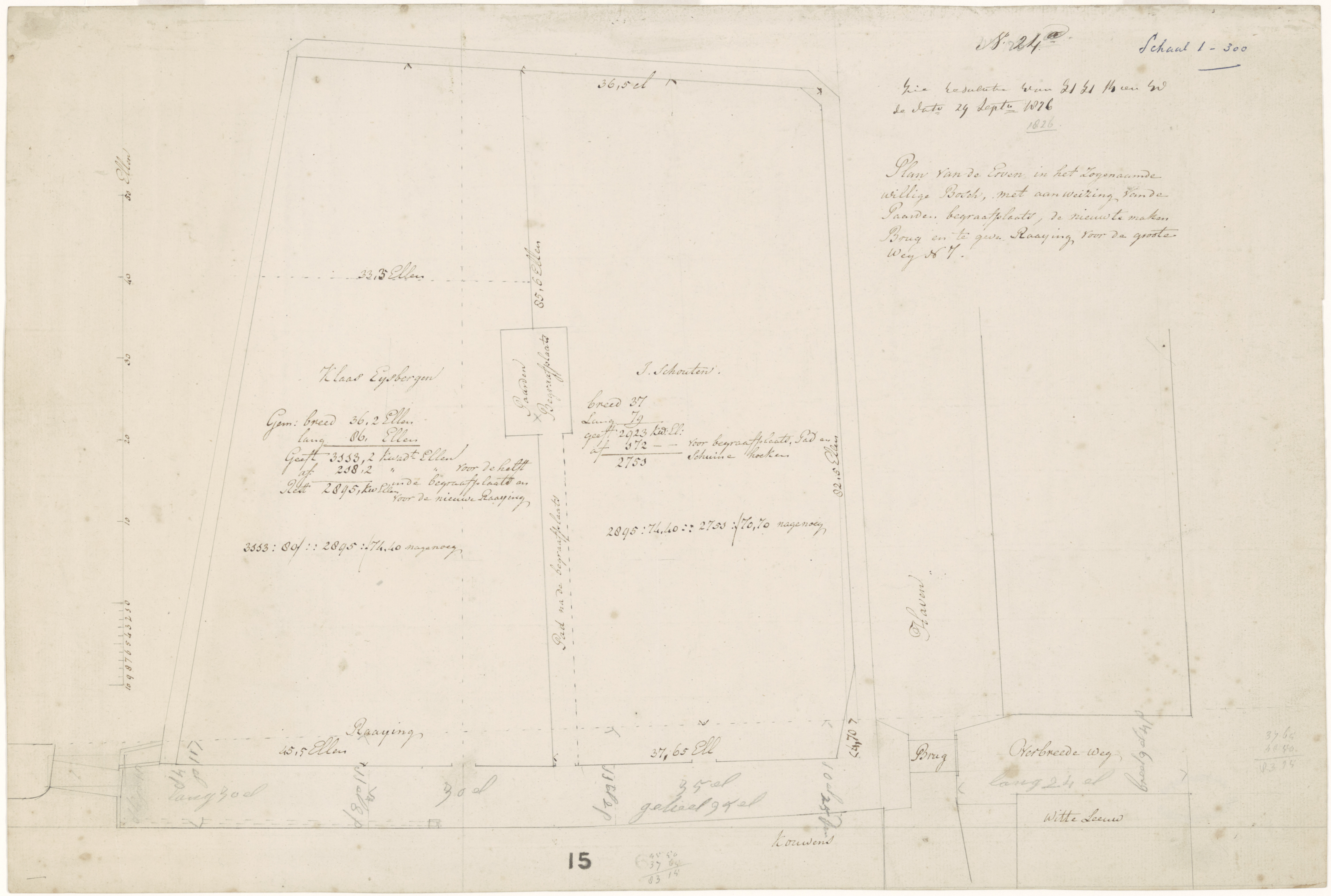 - Kaart met nauwkeurige afmetingen van het zgn. Wilgenbos. Met aanduiding van de oppervlaktes van diverse percelen, de paardenbegraafplaats en het pad daar naar toe. Voorts de de raaiing van de nieuwe weg no. 7 (naar het zuiden) en de ligging van de nieuw te bouwen brug.
