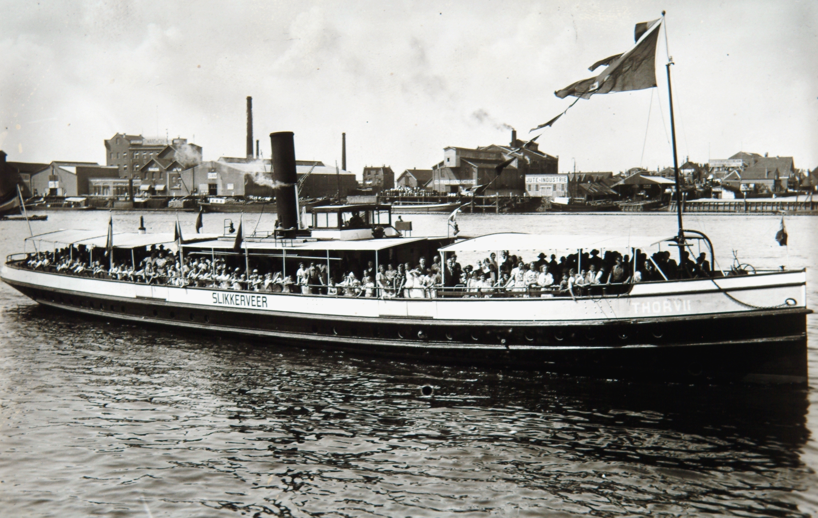 De "Thor VII" op de Oude Maas ter hoogte van de Hooikade. De passagiers maken een tocht …