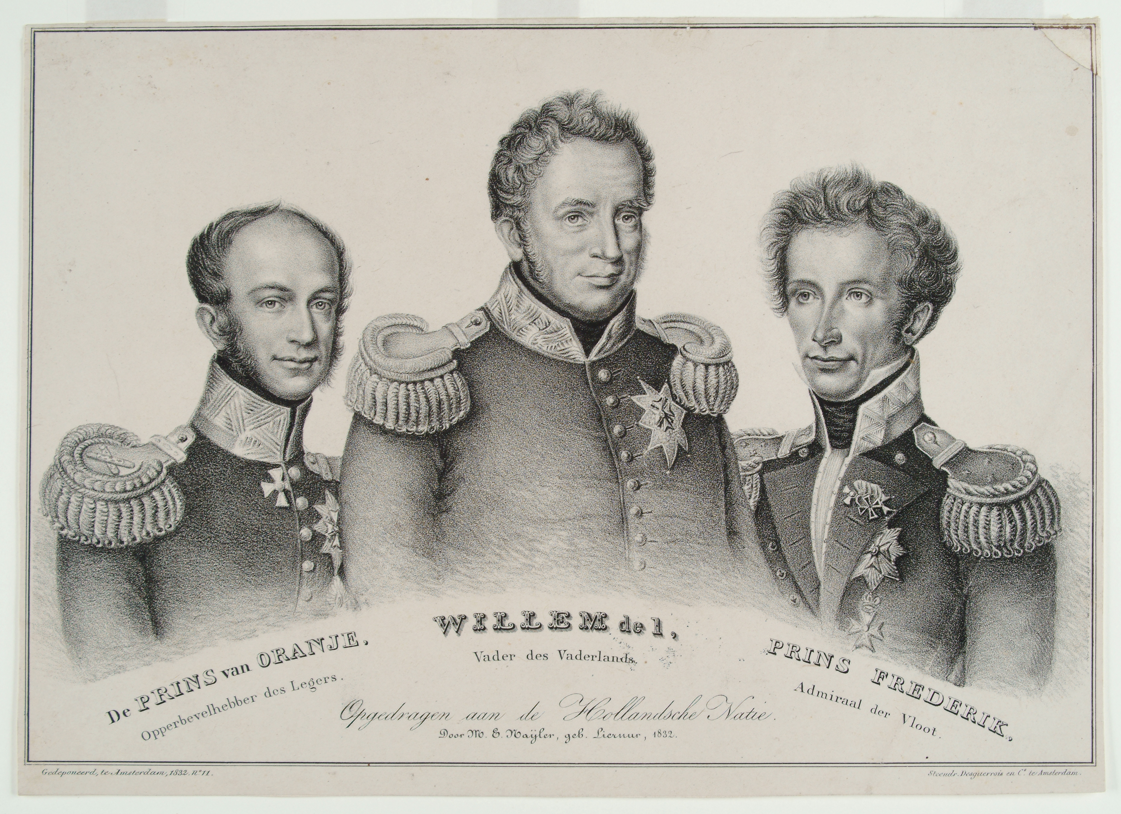 - Portret van Willem I Aan weerszijden Willem II en prins Frederik
