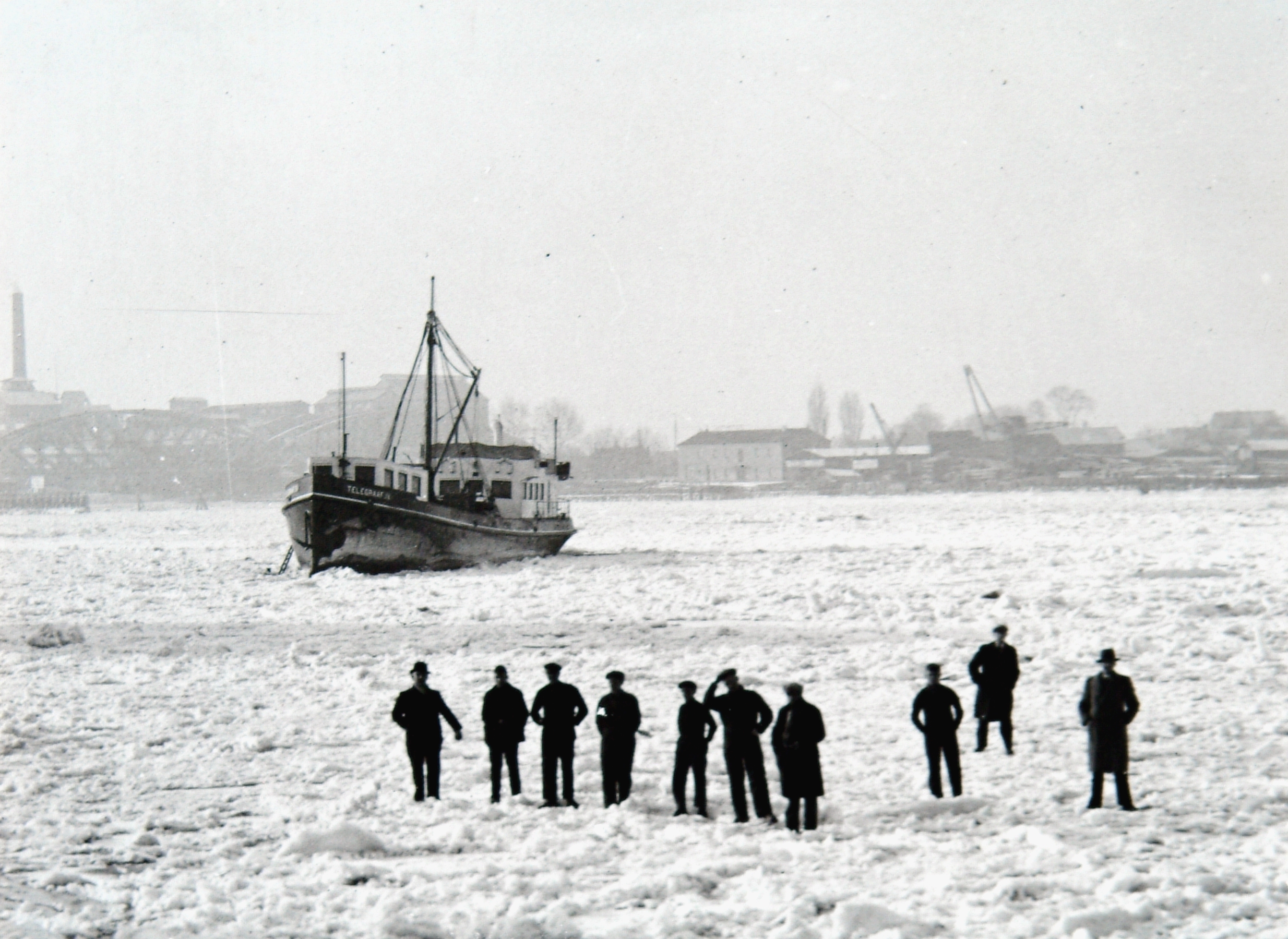- Dichtgevroren Oude Maas ter hoogte van de Hooikade in de richting van de spoorbrug naar Zwijndrecht. Ter hoogte van de Bomkade lag "Telegraaf IV" drie dagen vast in het ijs.
