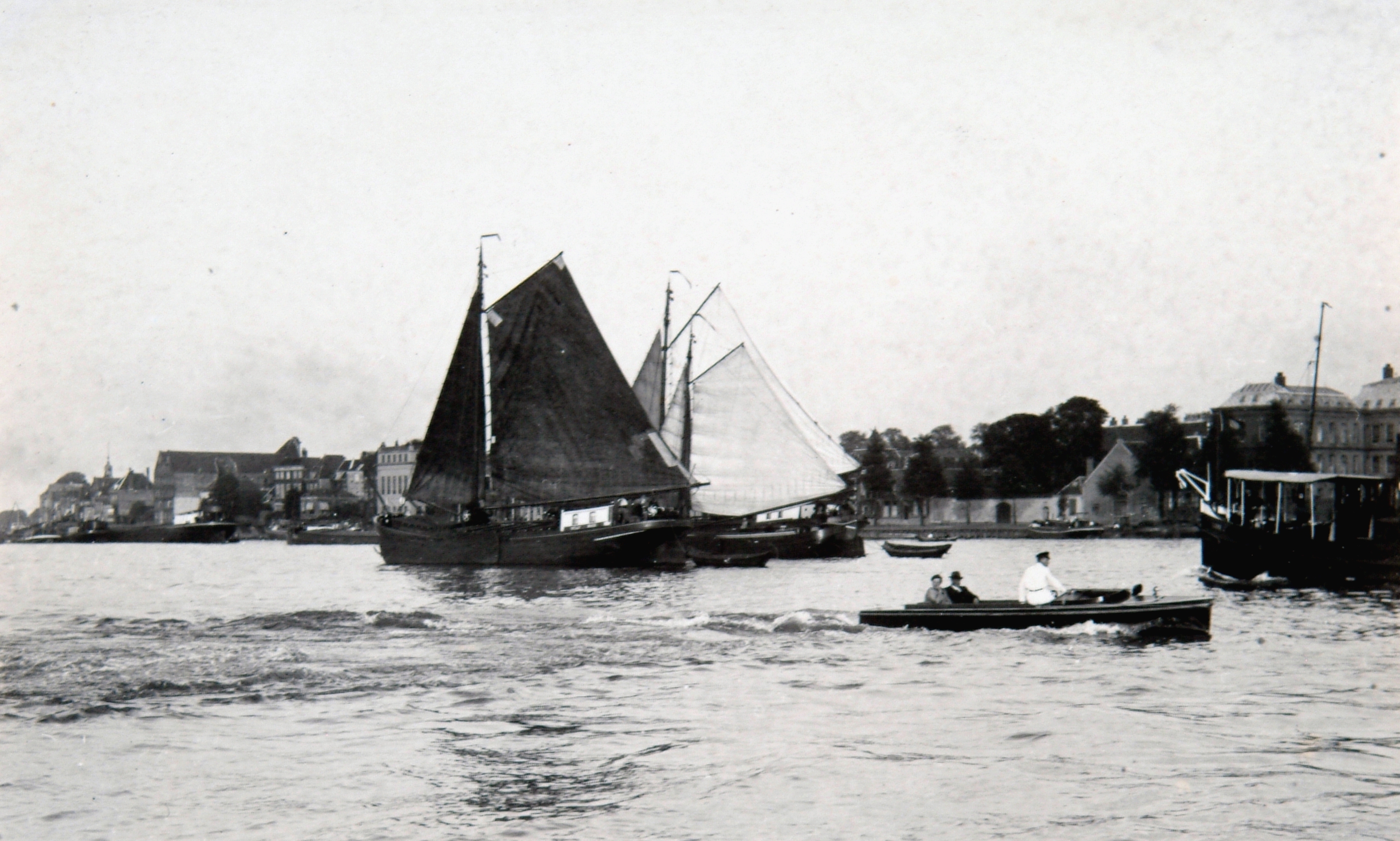 De Oude Maas met zeilvrachtschepen, gezien vanuit Zwijndrecht, richting Buiten Walevest