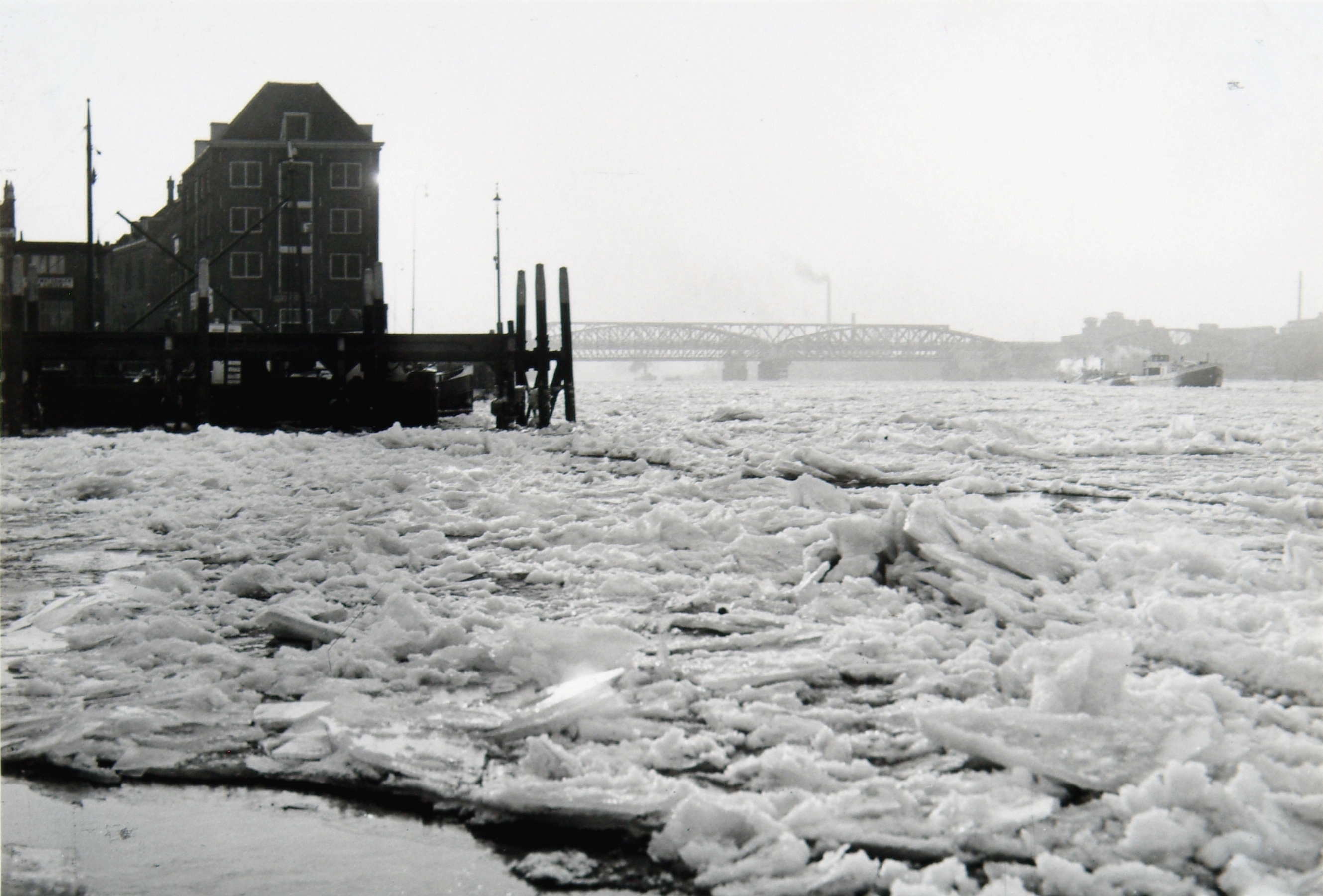 - Kruiende ijsschotsen in de Oude Maas, gezien vanaf de Bomkade richting de spoorbrug naar Zwijndrecht. Het hoge pand staat aan de Kalkhaven.