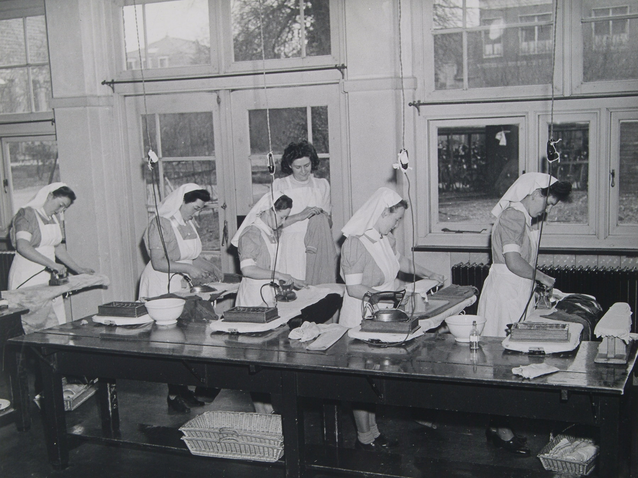 - Strijkende en persende gezinsverzorgsters in opleiding van de Industrie- en Huishoudschool Doelesteyn aan het Steegoversloot