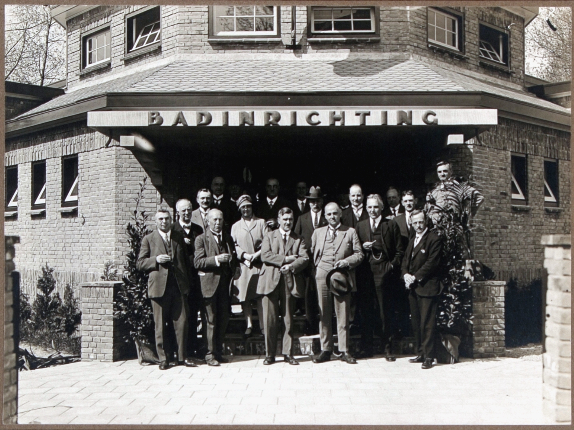- Voor de ingang poseren een groep wethouders, gemeenteraadsleden e.a. genodigden ter gelegenheid van de opening. Met name zijn vermeld: Mr. K.J. Poll (gemeentesecretaris) Dr. P. Romijn, directeur van gemeentewerken Versteeg, en de wethouders Van Huiden, Stoop, Sanders en Jansen