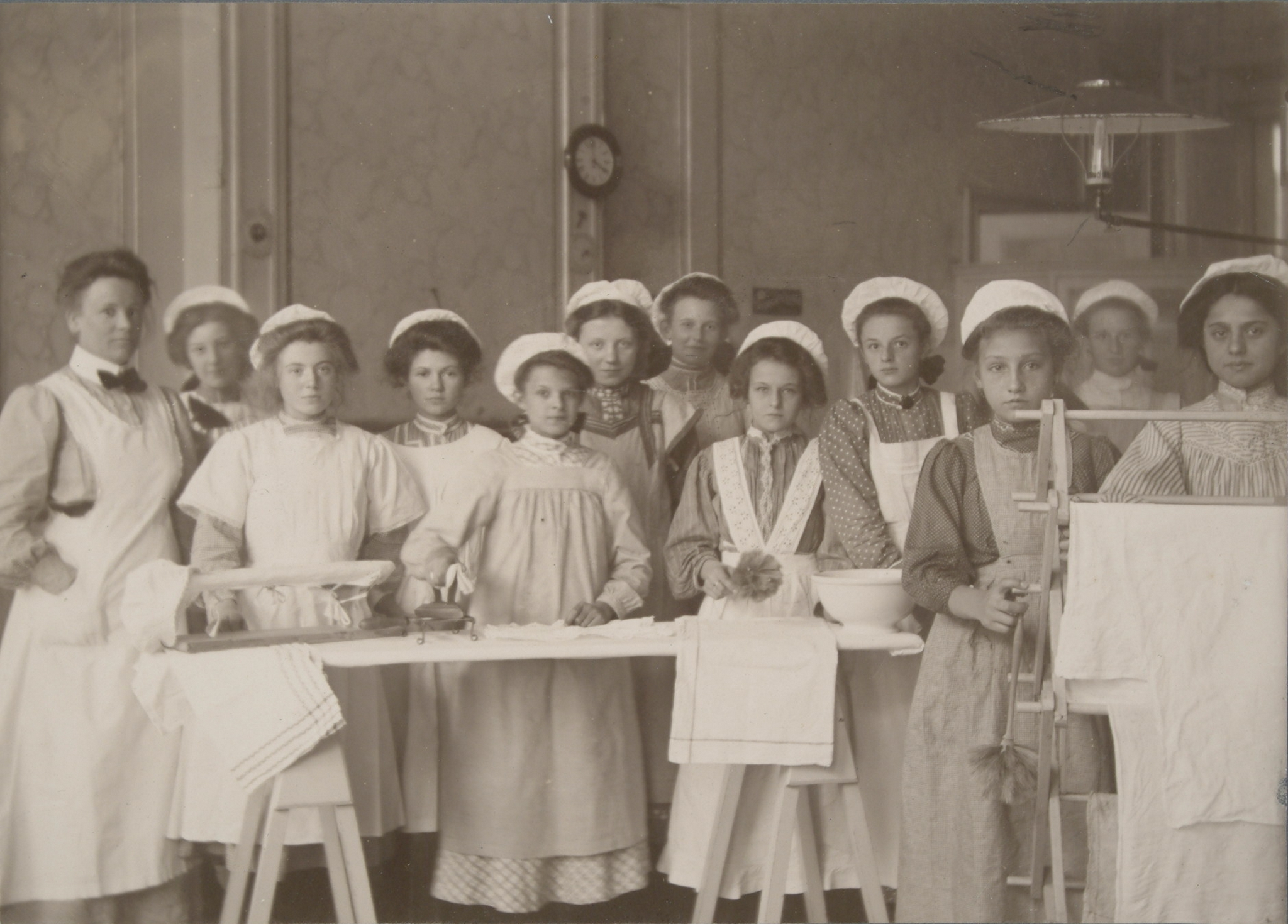 Strijkende leerlingen van de Industrie- en Huishoudschool Doelesteyn aan het …