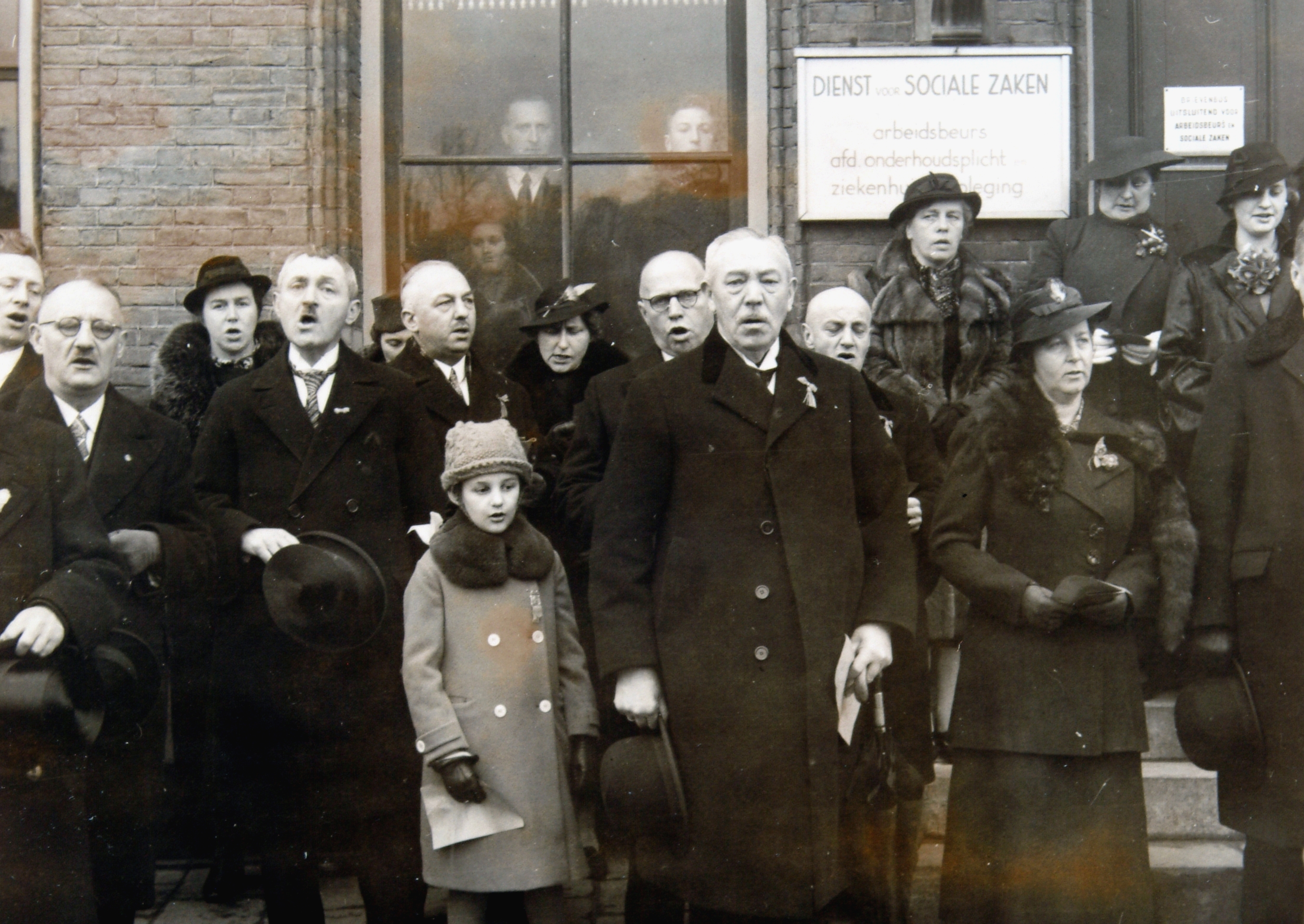 Zingen van het Wilhelmus door gemeentebestuurders e.a. op het Beverwijcksplein voor het arbeidsbureau t.g.v. de geboorte van prinses Beatrix. V.l.n.r. wethouder Dicke, secretaris Mr. Poll, Vergroesen, Bos, Duits en Mw Bleeker.