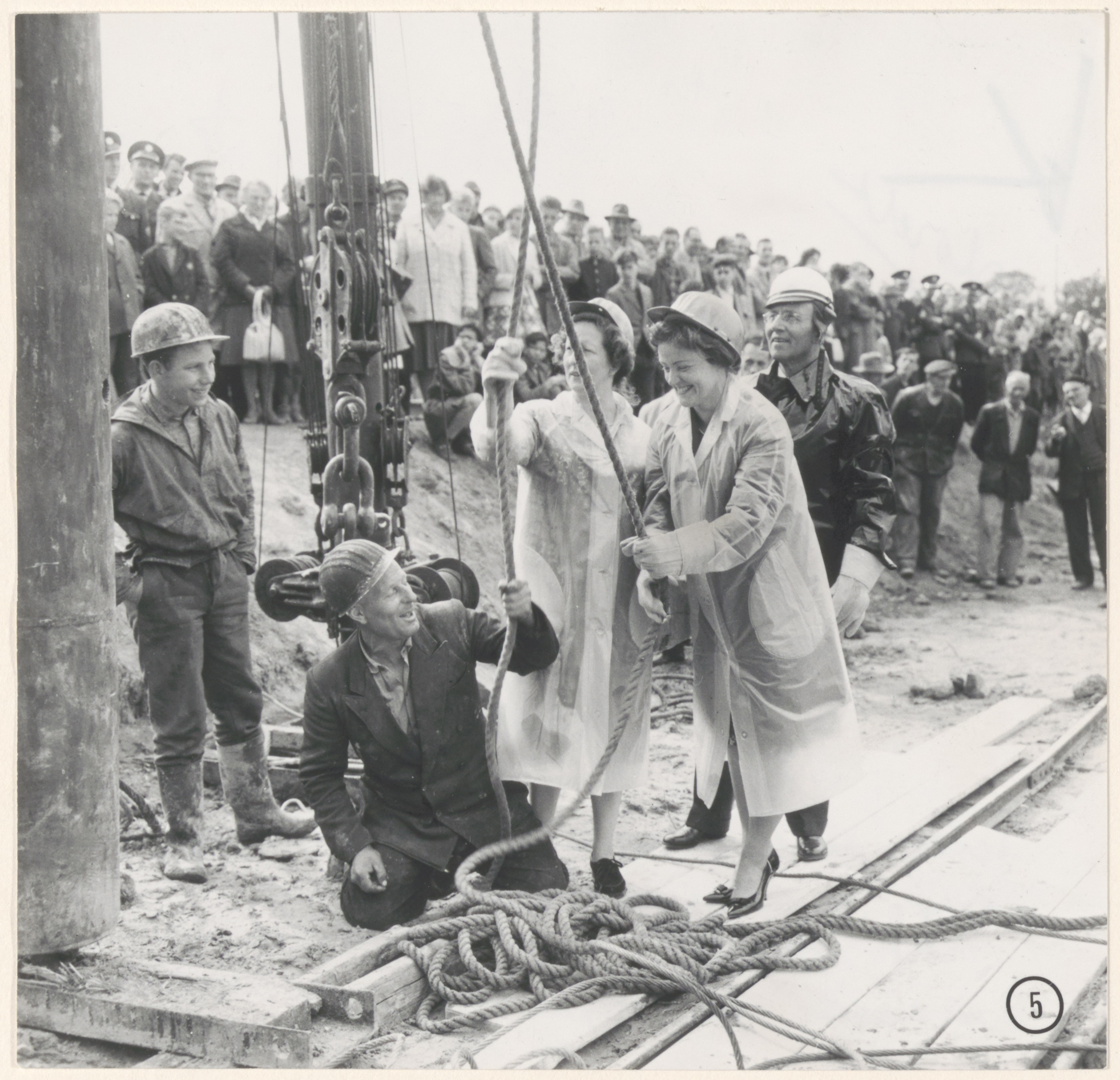 De echtgenotes van de ministers Aertsen en Toxopeus slaan de eerste paal voor het …