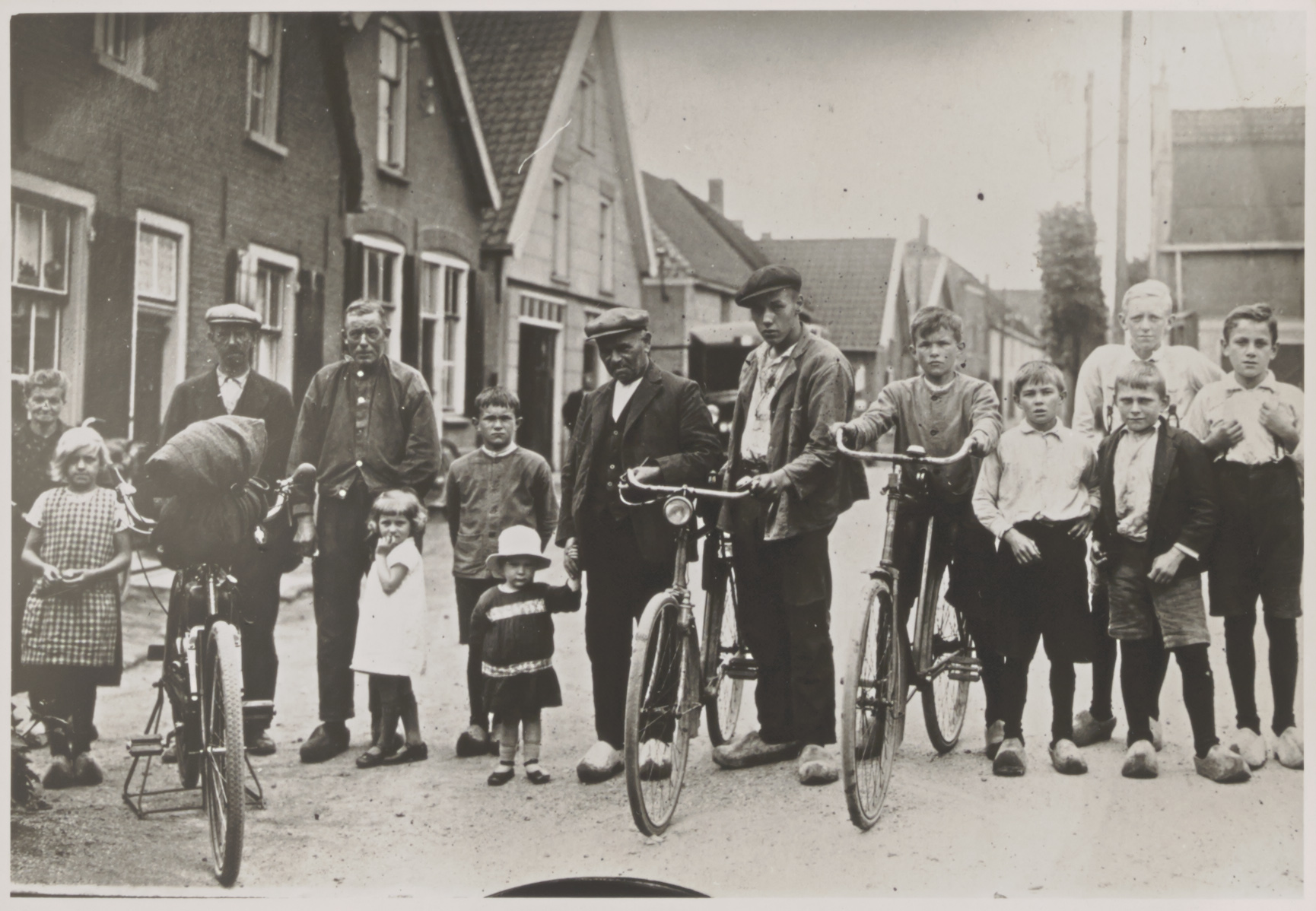 bromfietsen / brommers dorpen / dorpsgezichten fietsen / rijwielen groepsportretten kinderen klompen