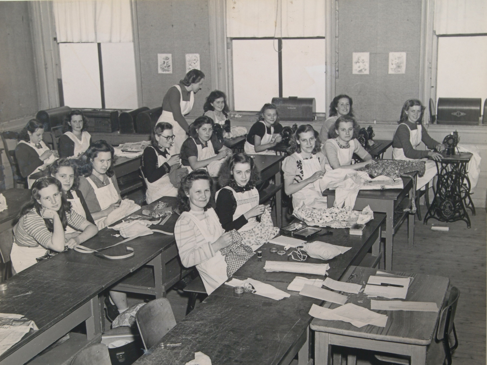 Leerlingen tijdens naailessen van de Industrie- en Huishoudschool Doelesteyn aan het Steegoversloot