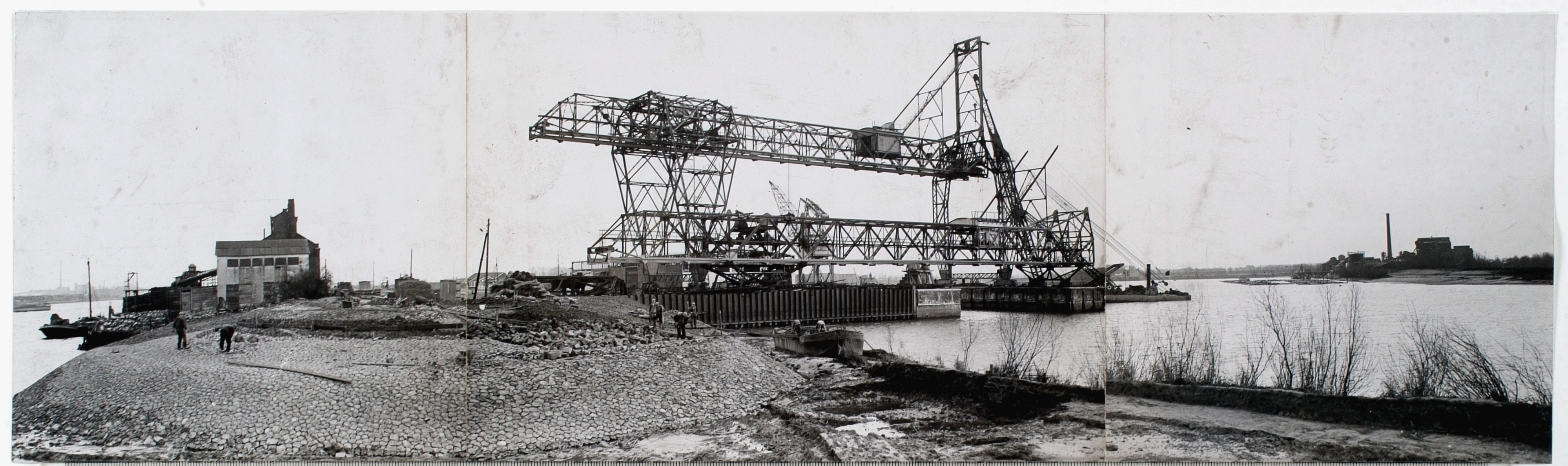 De brugkranen lopen aan de ene zijde over de Caissonpier en aan de andere zijde over de wal aan de kant van de 's-Gravendeelsedijk. Hier is goed te zien dat de beschoeiing van het noordelijk havenhoofd met basaltblokken al bijna af is. De doorgang van de haven vanuit het Malle Gat is nog geen feit. De 's-Gravendeelsedijk moet hiertoe op het juiste moment nog verder afgegraven en uitgebaggerd worden. Rechts aan de Kilweg de stikstoffabriek. Verder een leuke poging om van drie foto's een panoramafoto te maken. 552_331577