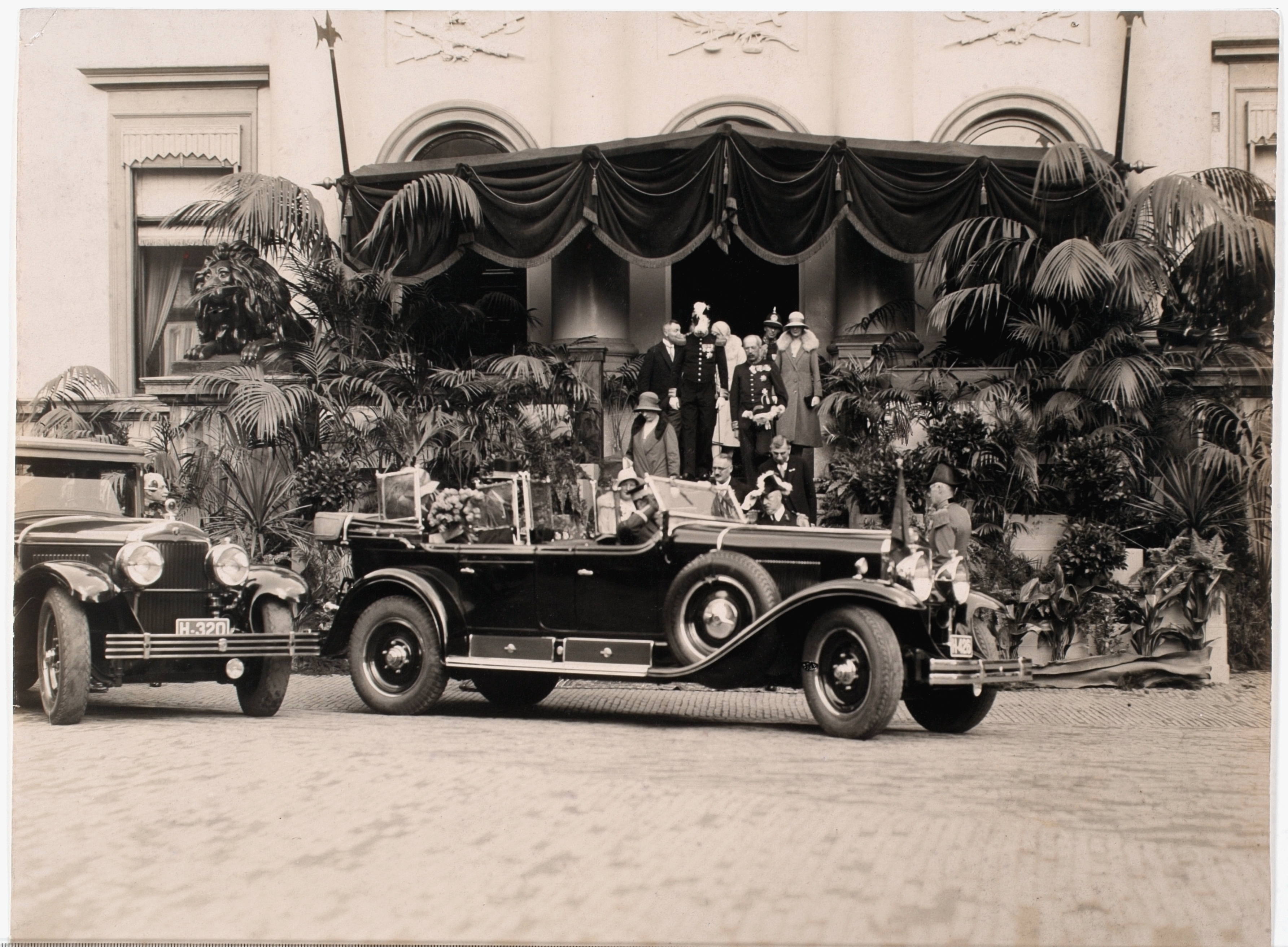 - Vertrek van Koningin Wilhelmina en Prins Hendrik en prinses Juliana van het baldakijn op het Stadshuisplein. Bezoek n.a.v. opening Wilhelminahaven