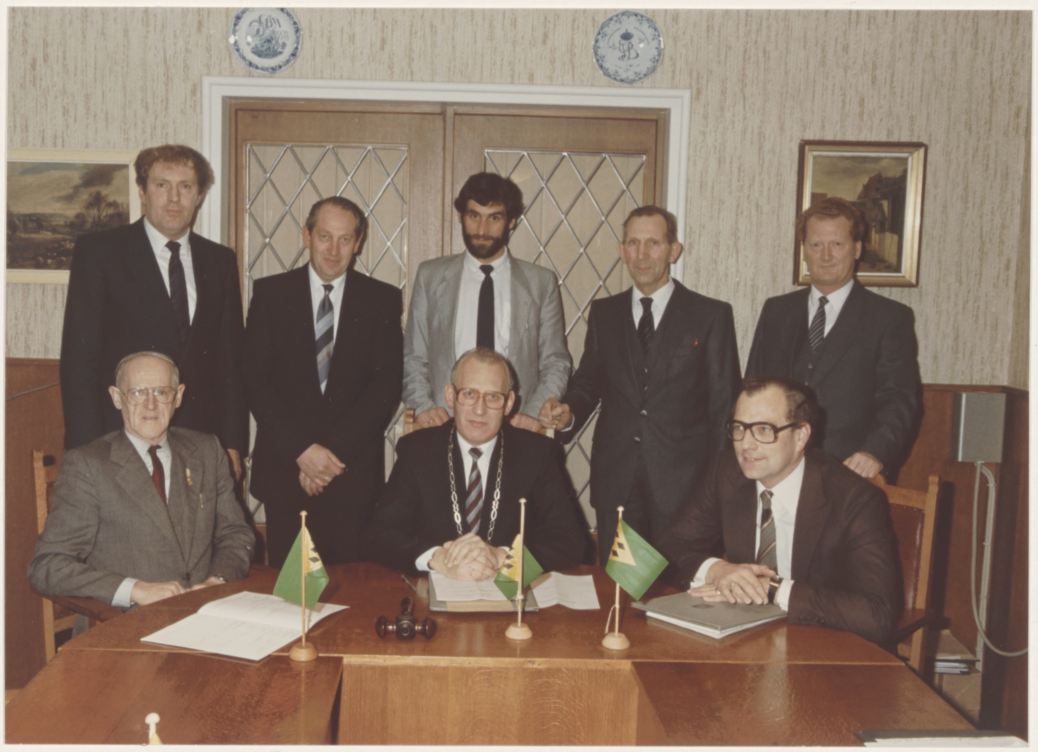 - V.l.n.r. staand: raadsleden G. Alting (VVD), A. Verhoeven (CDA), J. Heijkoop (VVD), L. van Rees (SGP), A. Heuvelman (PvdA). Zittend: wethouder A.D. Heijkoop (CDA), loco-burgemeester C.A. Noorlland (SGP), waarnemend secretaris W.A. Timmer.