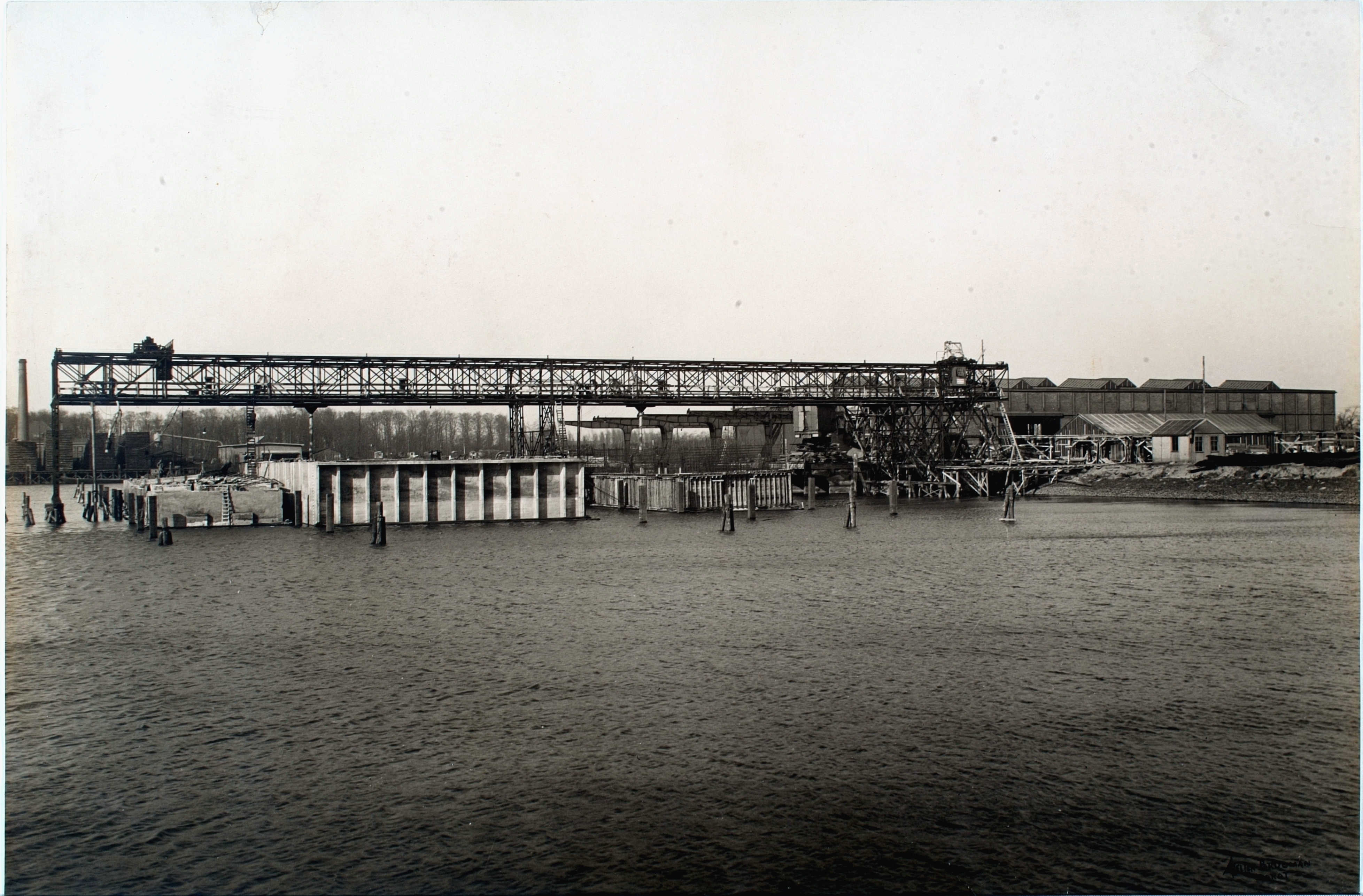De installatie bestond uit o.a. 2 ijzeren bruggen van ca 40 mtr. lang en een drijvend dok voor de te bouwen caissons. Achter de installatie de creosoteerinrichting .Ca 1928.
