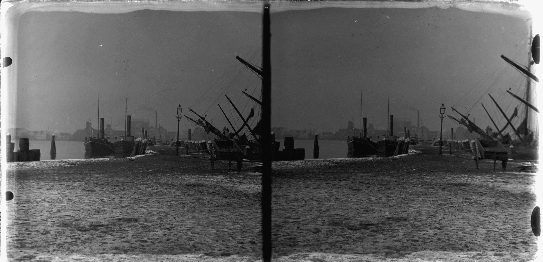 - Stereofoto vanaf de Bomkade over de Bomhaven naar Zwijndrecht. De schepen liggen afgemeerd langs de steiger die in de haven is gebouwd.