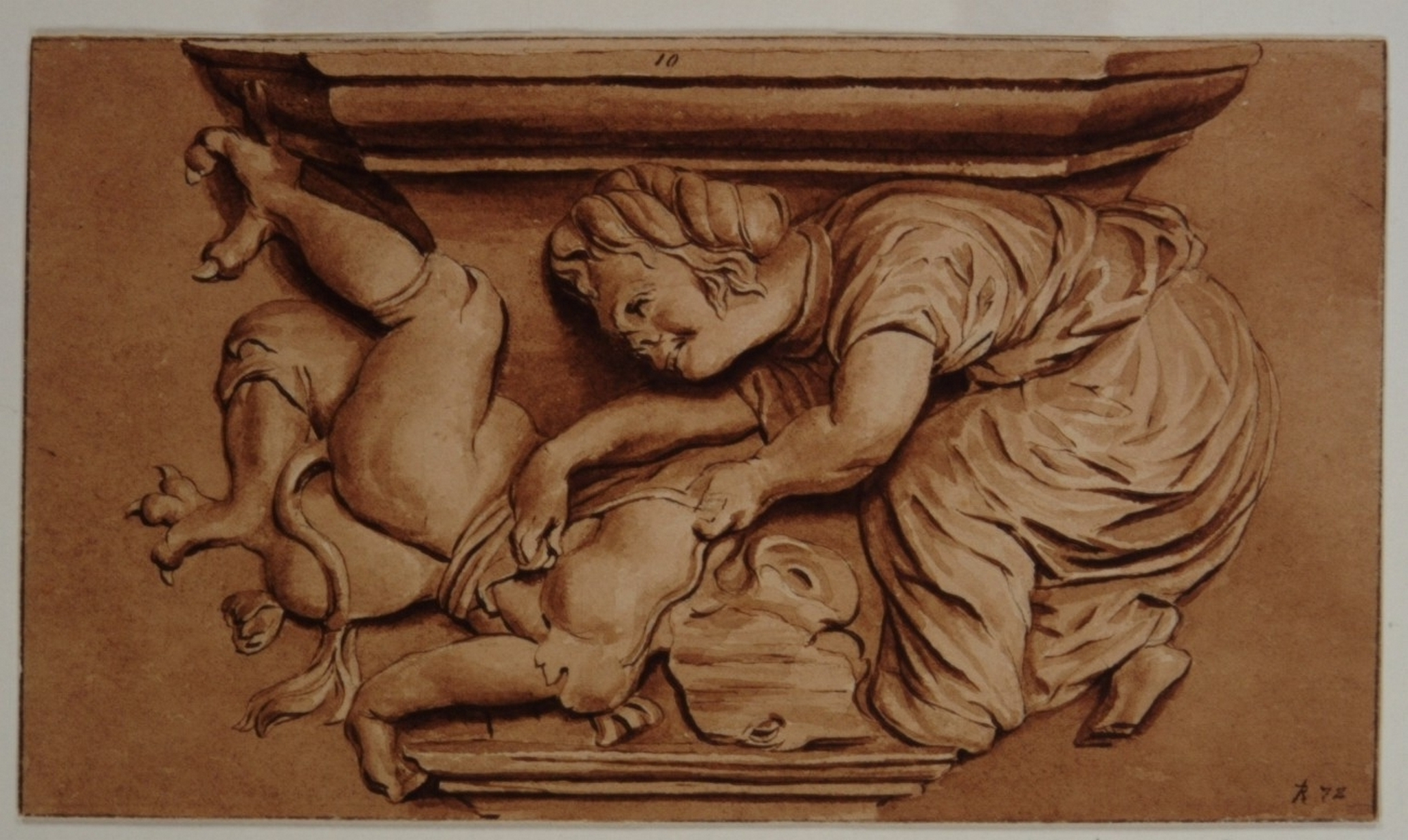 Afmetingen: Hg. 10.7, br. ca. 19 c.; Volgens Balen, blz. 1091: 'Griet die de duivel op het kussen bindt' (De Heilige Margaretha van Antiochië die de duivel, in de gestalte van een draak, overwon)
