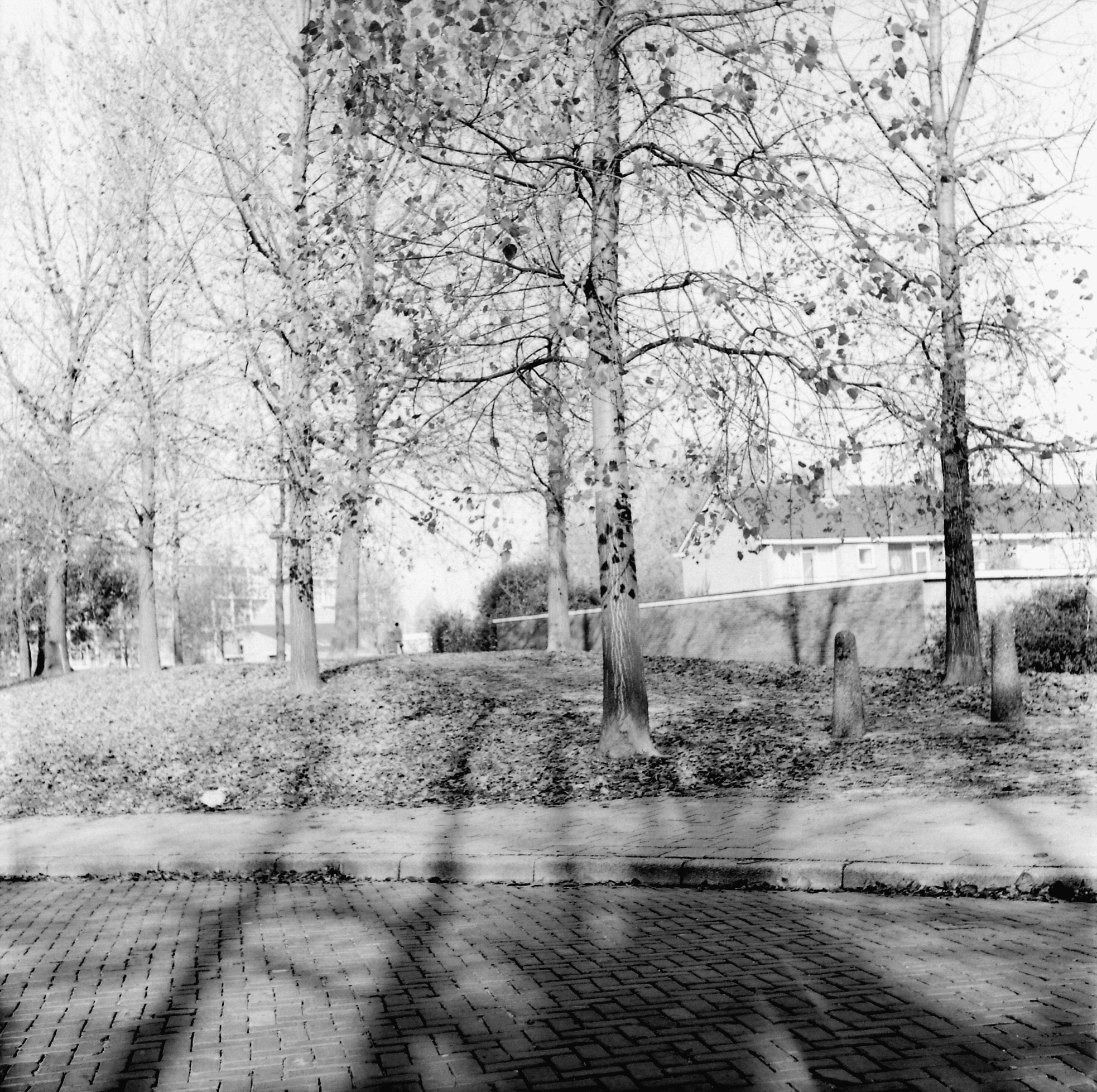Hugo van Gijnweg hoek Spirea. Waar die twee paaltjes staan was de Oudendijk
