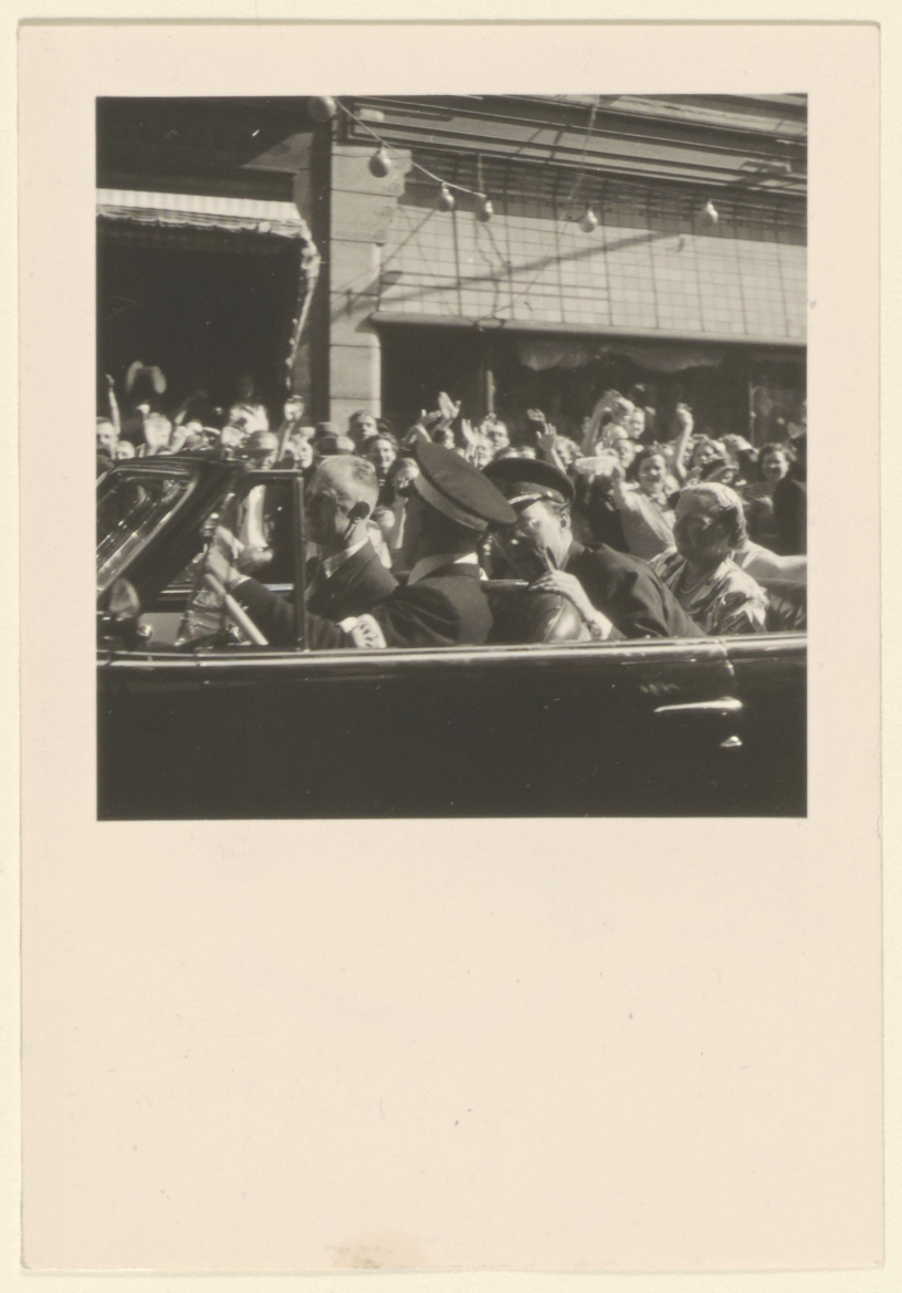 - H.K.H Prinses Juliana en Z.K.H. Prins Bernhard der Nederlanden op de Voorstraat tijdens een bezoek aan Dordrecht.