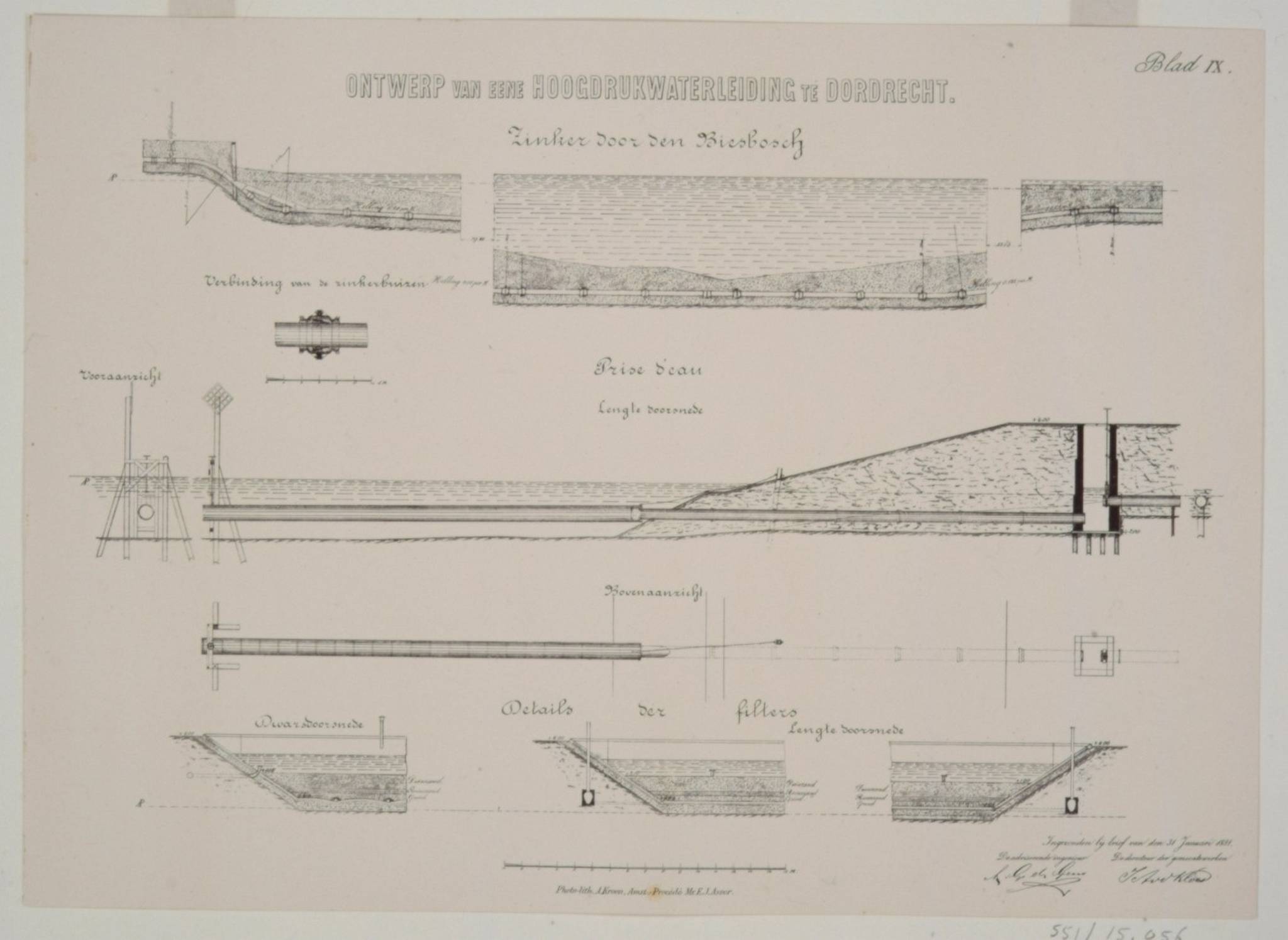 hxb: 25,8 x 31,5 cm. De ontwerpen voor de drinkwaterleiding zijn ingediend bij het Gemeentebestuur op 31 januari 1881. Dit ontwerp is uitgevoerd met een wijziging betreffende de plaatsing van de watertoren, die in 1882 niet op het gors de Staart, maar midden in de Biesbosch (nabij het Wantij) is gebouwd. De waterleiding is in februari 1883 in gebruik gesteld.
