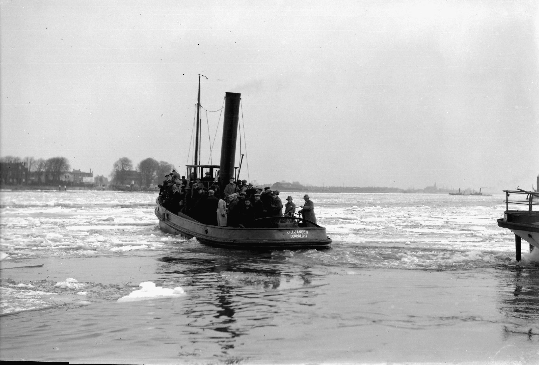 Een sleepboot doet dienst als voetveer naar Zwijndrecht tussen ijsschotsen op de Oude …