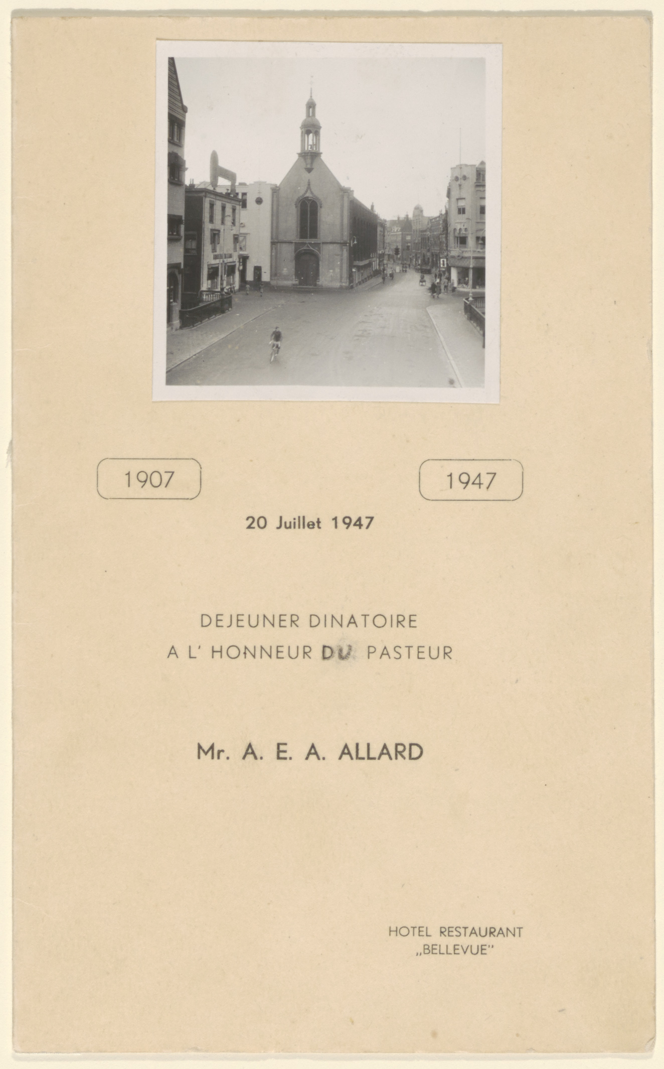 - Menukaart van een déjeuner dinatoire in Hotel Bellevue ter ere van de pasteur suffragent van de Waalse gemeente Dordrecht, Ds. A.E.A. Allard. De afbeelding is het kerkgebouw van de gemeente op de hoek van de Voorstraat en de Visstraat.