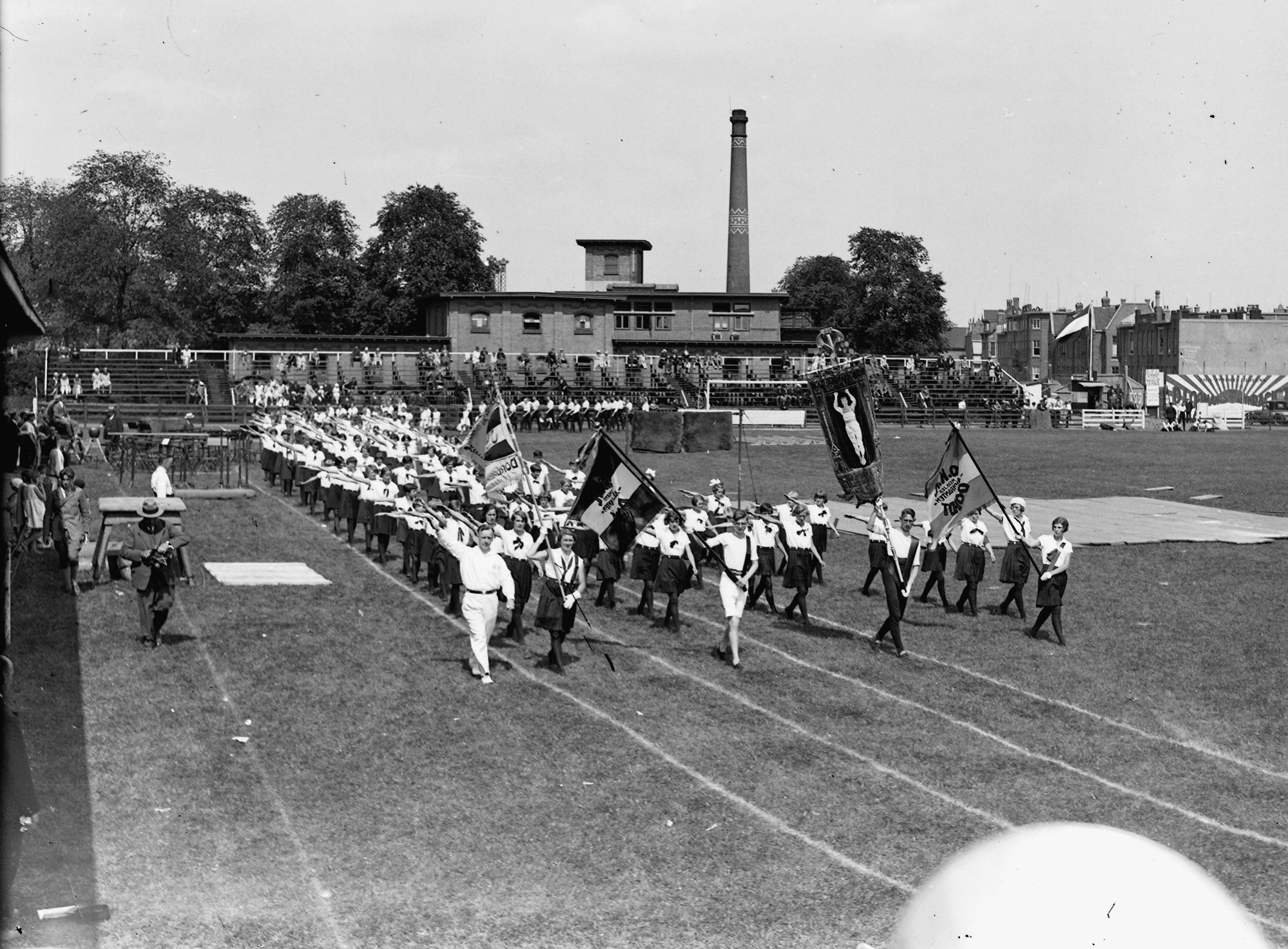 - fabriekspijpen / schoorstenen gymnastiekverenigingen jubilea sportterreinen tribunes vaandels