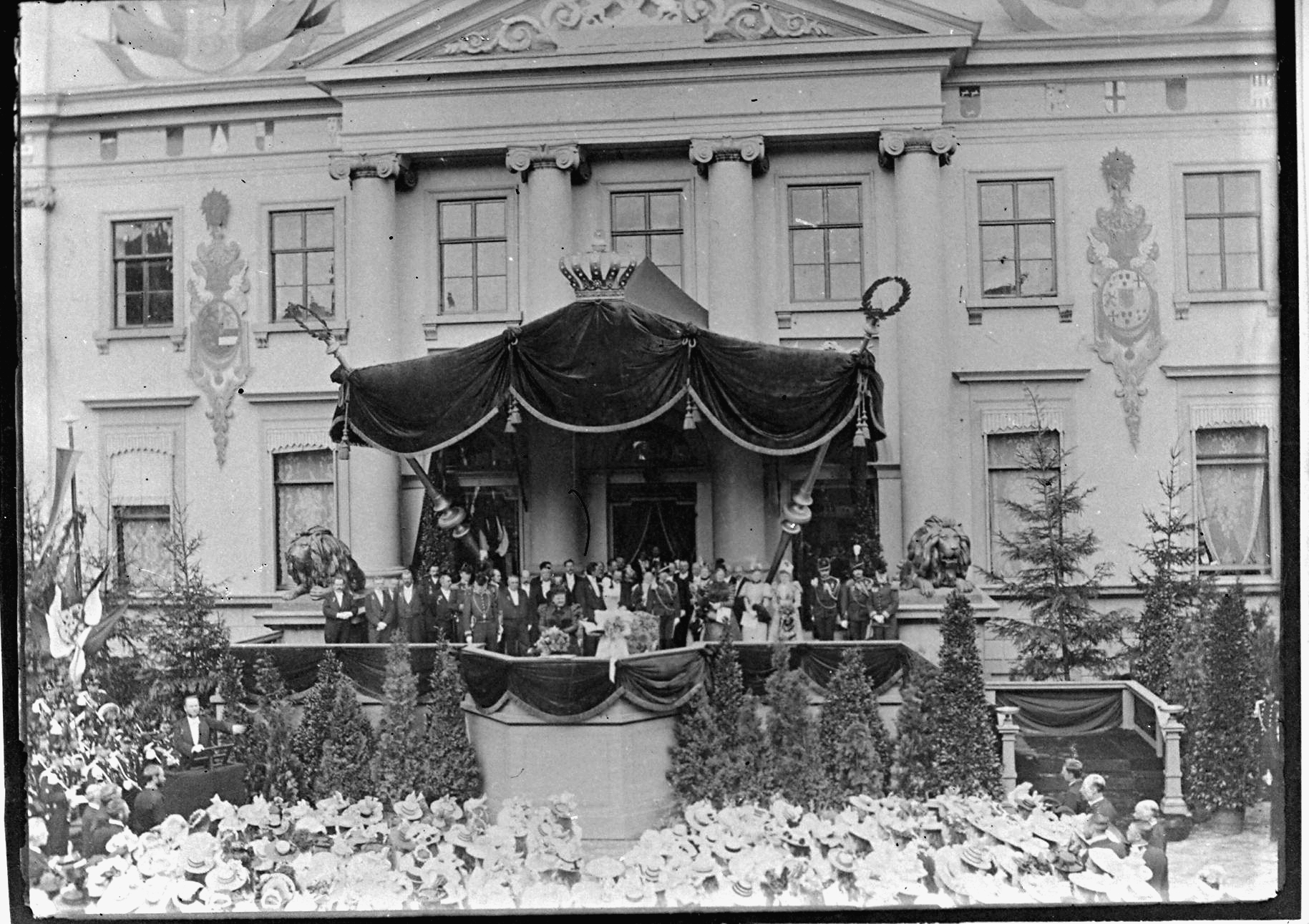- Koningin Emma met dochter Wilhelmina tussen genodigden op de tot balkon omgebouwde trappen van het stadhuis.