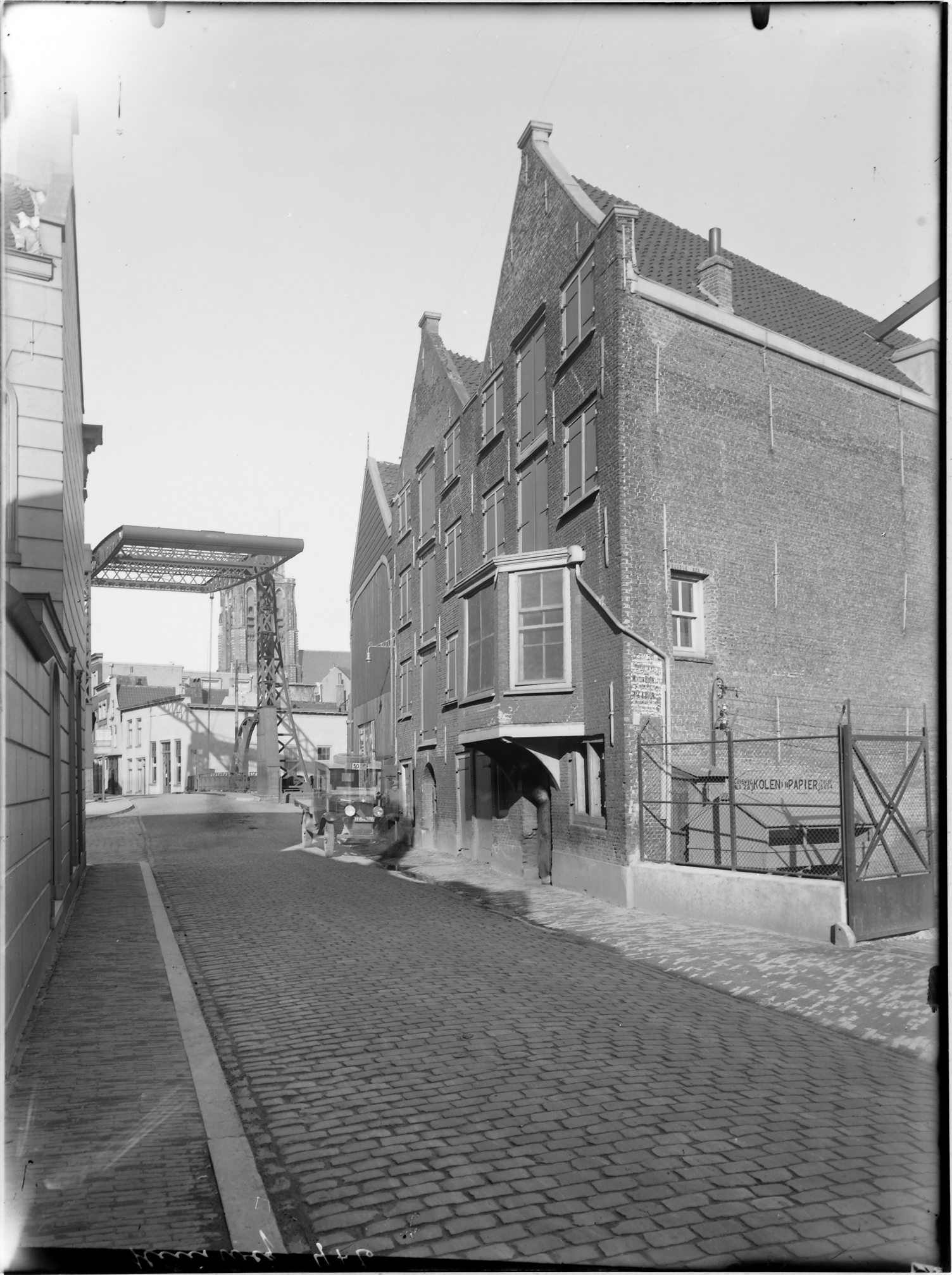 1e rechts werd gehuurd door kolenhandel S. van Rhijn, het 2e door Henk Naaktgeboren, grossier in aardappelen, wonende Breitnerstr. 6 in Dordrecht. Chevrolet vrachtauto met no. H 84376, staat voor het pakhuis, 3e pakhuis was in gebruik door houthandel v/d Kloet.