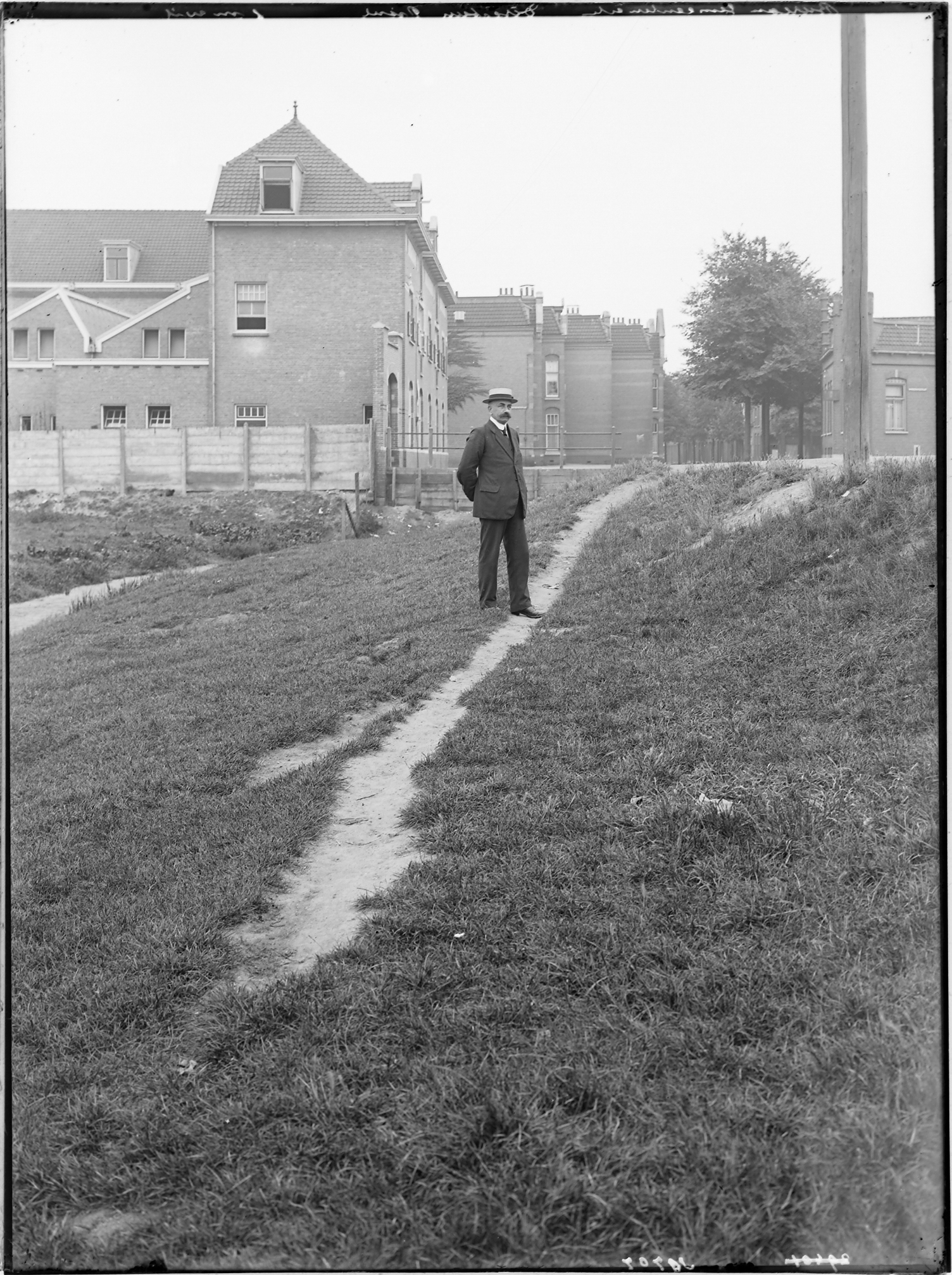 - De Krommedijk gezien van nabij de spoorwegovergang naar de Oranjelaan; links de coöperatieve broodbakkerij Vooruit en huizen tussen de Christiaan de Wetstraat en de Martinus Steynstraat; op de voorgrond H. Brand, hoofdopzichter Gemeentewerken van 1916 tot 1938
