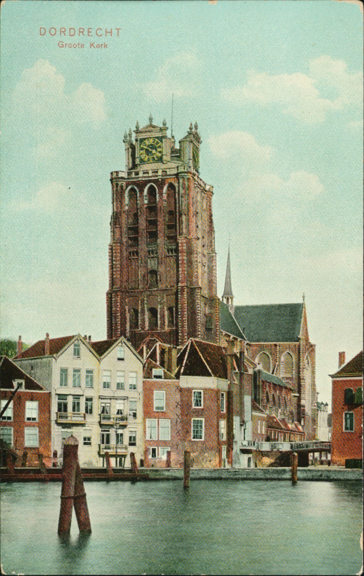 De Grote Kerk en de achterkant van huizen aan de Korte Geldersekade, gezien over de Bomhaven.