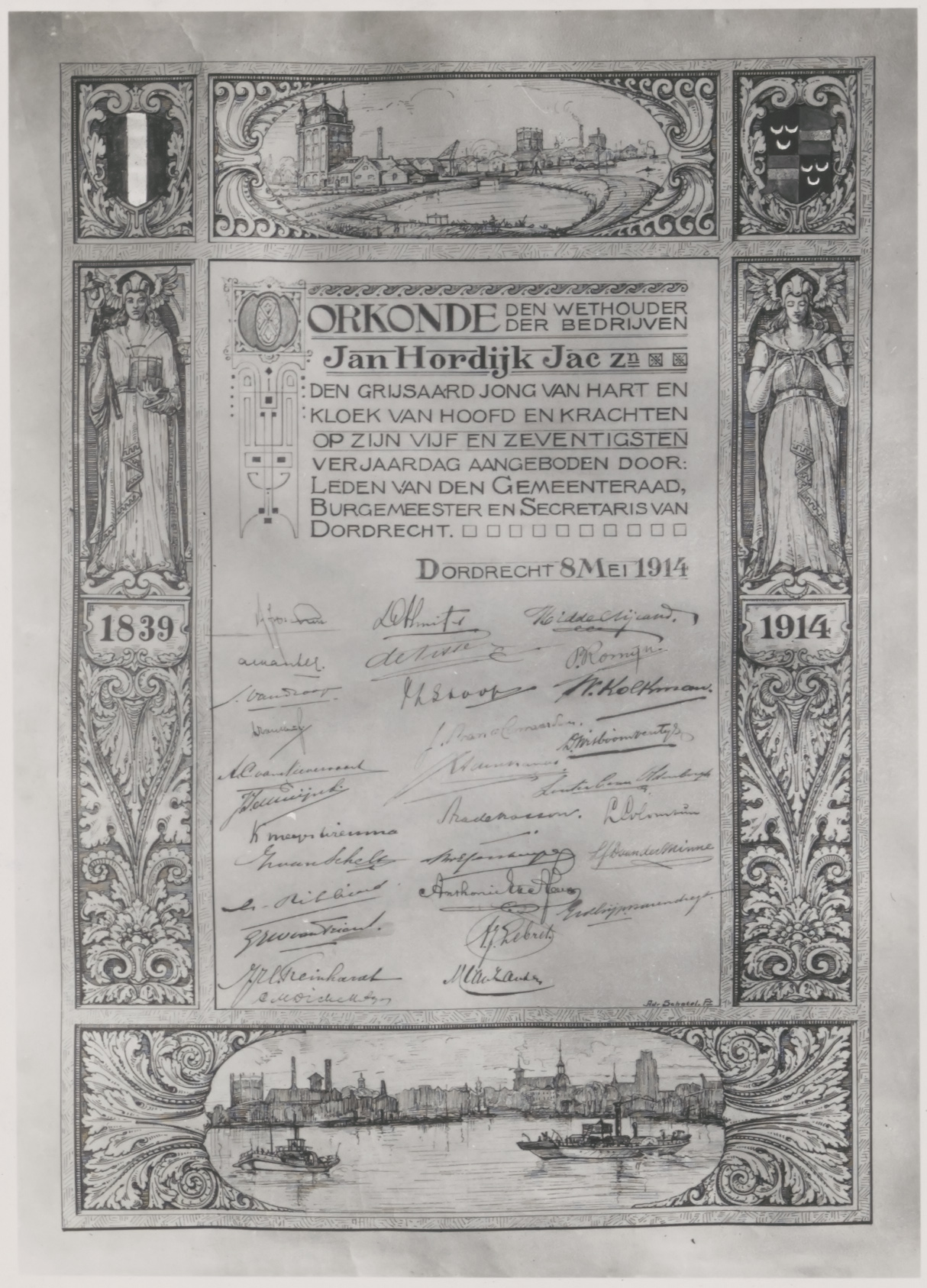 - Jan Hordijk Jac.zn. Geboren te Dordrecht 8 mei 1839, overleden te Dordrecht. Kaashandelaar, lid van de Raad en wethouder van bedrijven 1897 - 1917. Oorkonde, hem aangeboden op zijn 75e verjaardag (1914) door de leden van de Raad, de burgemeester en secretaris van Dordrecht.