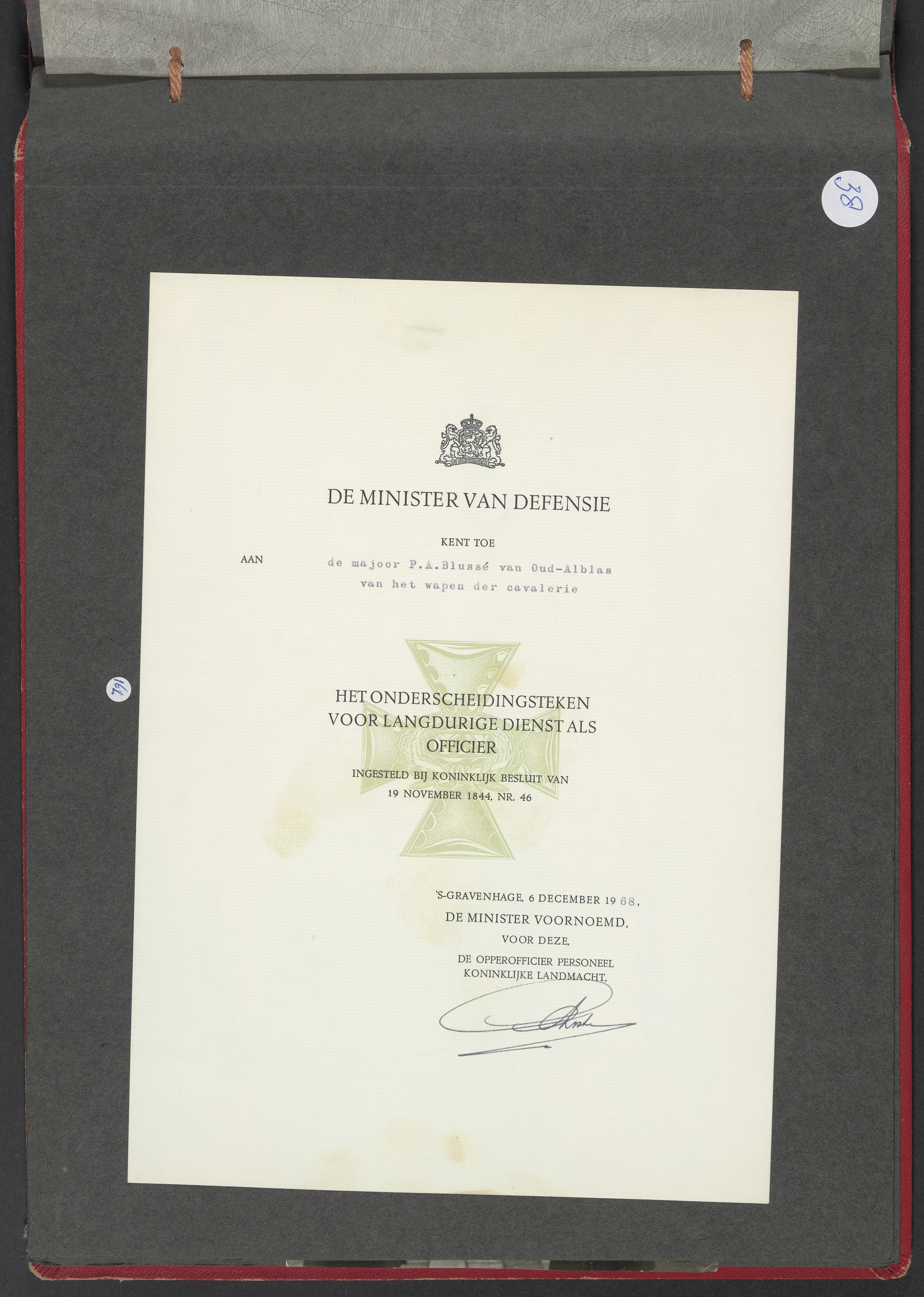 (fotoalbum) De Minister van defensie kent toe aan de majoor P.A. Blussé van Oud-Alblas van het wapen der cavalerie het onderscheidingsteken voor langdurige dienst als officier, 6-12-1968