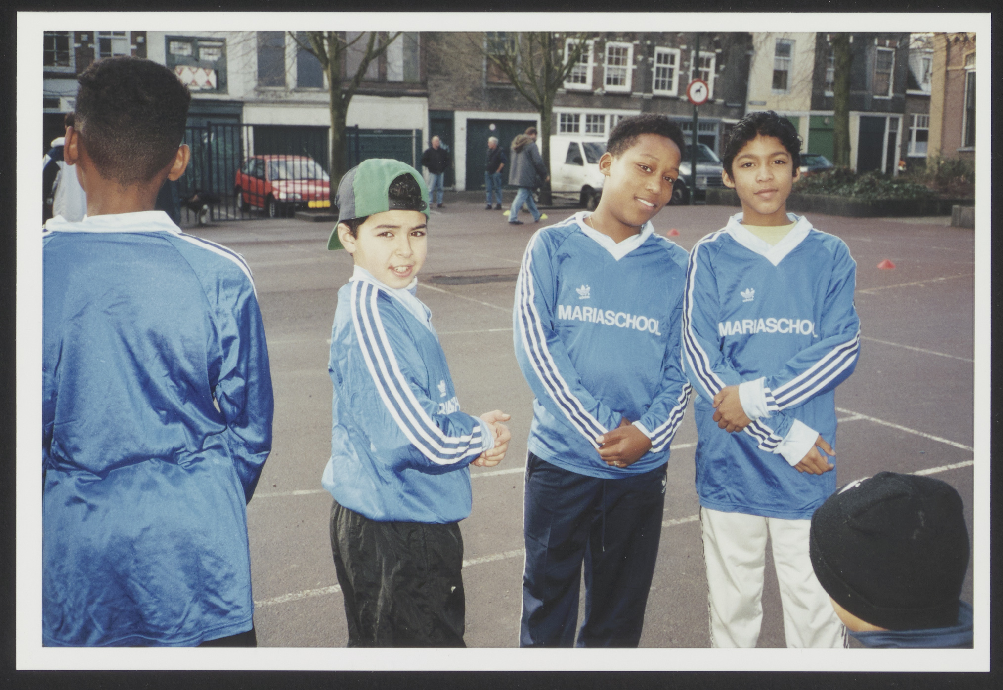Vier snotneuzen op het Weeshuisplein. Rechts Weeshuisstraat.
